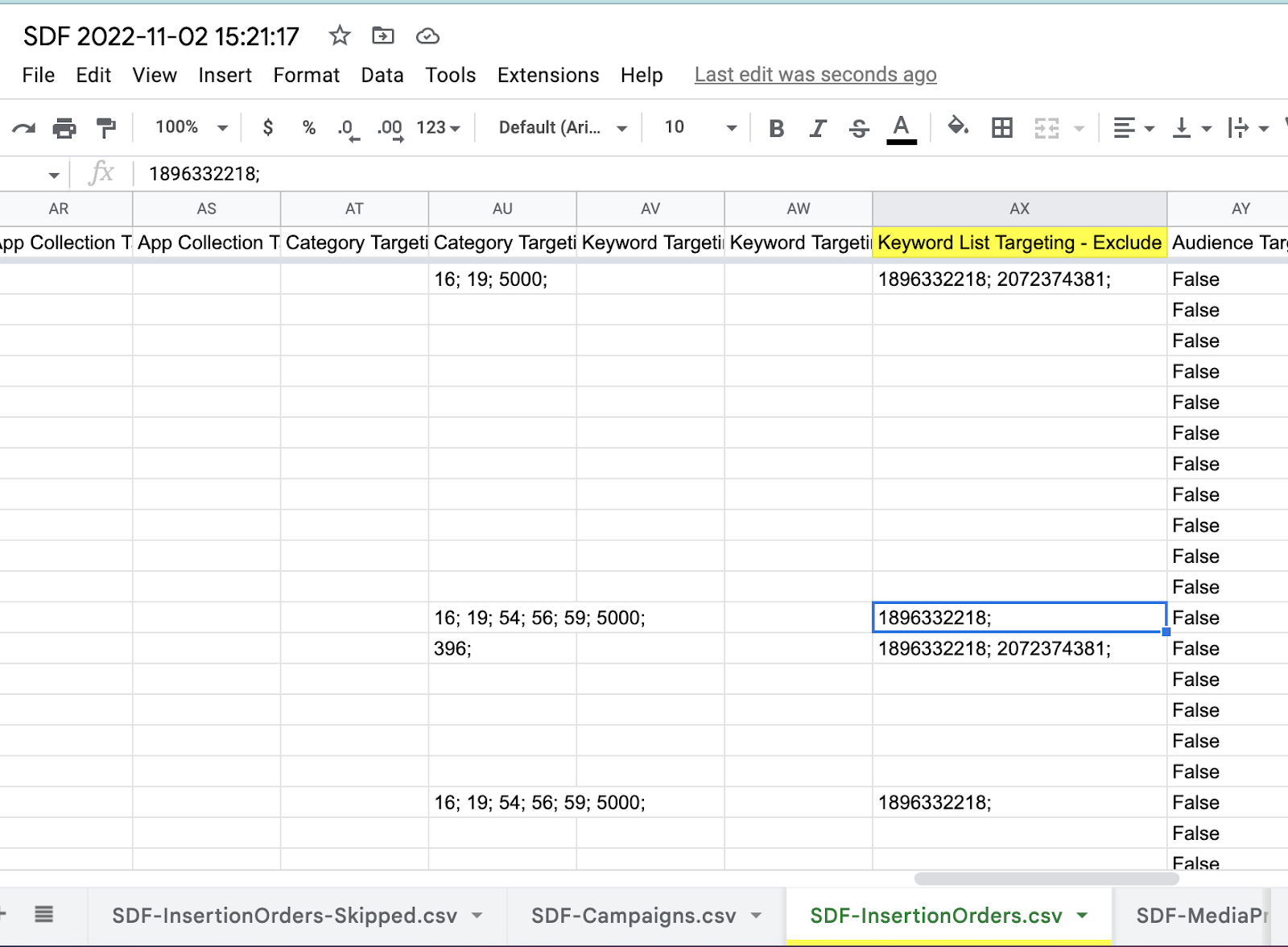 Find the ‘Keyword List Targeting - Exclude’ column. You will notice that the list IDs in that column are repeated in multiple rows. This is because the list under that ID is applied to multiple insertion orders under the same advertiser.