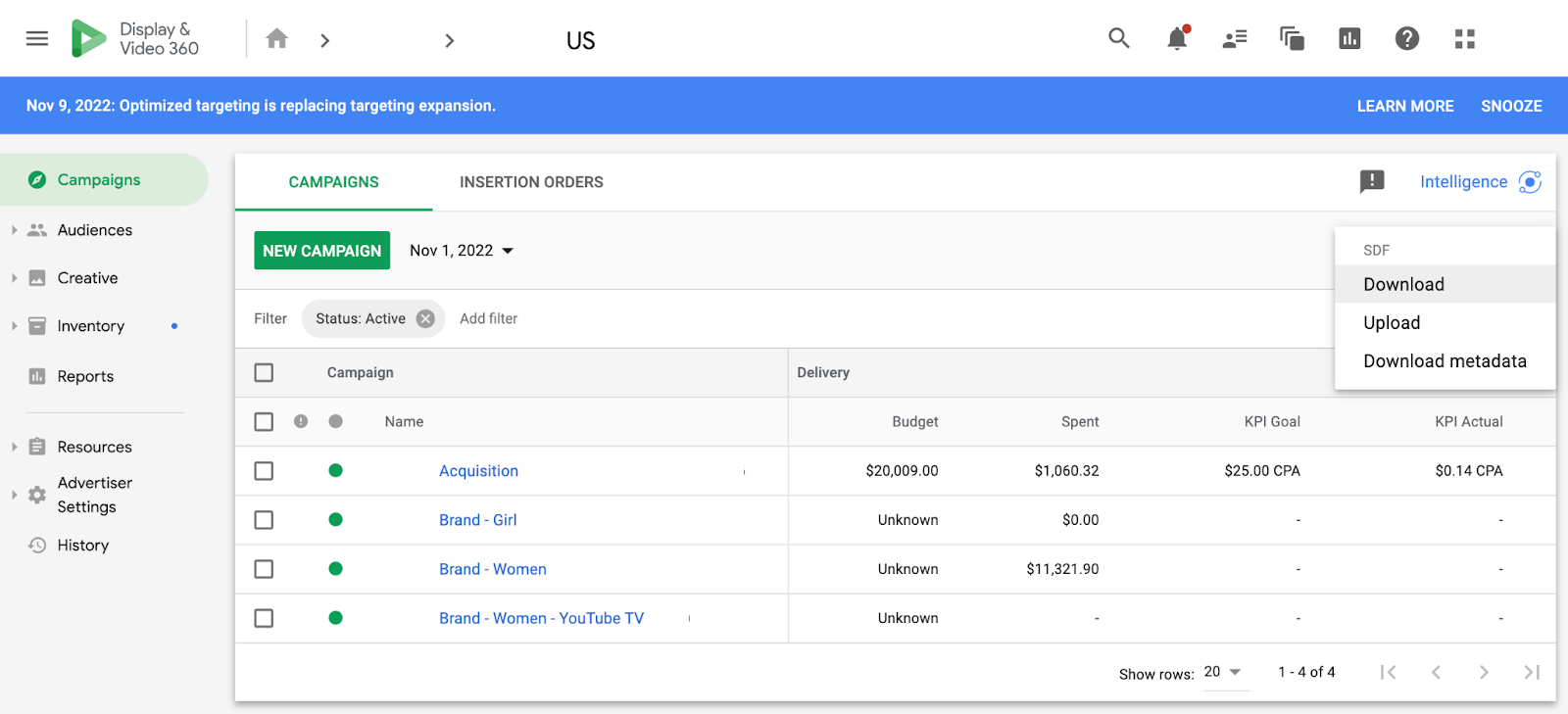 To find your List ID in DV360, navigate to the ‘Campaigns’ view for the Advertiser that your list will live in.