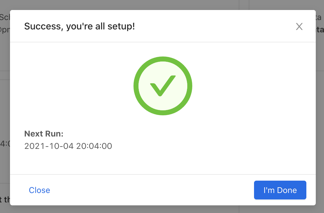 A confirmation pop-up box will show you the next run time based on your schedule. Click I’m Done to navigate back to the main page, or click Close to stay on the Review action page and continue adjusting your action.