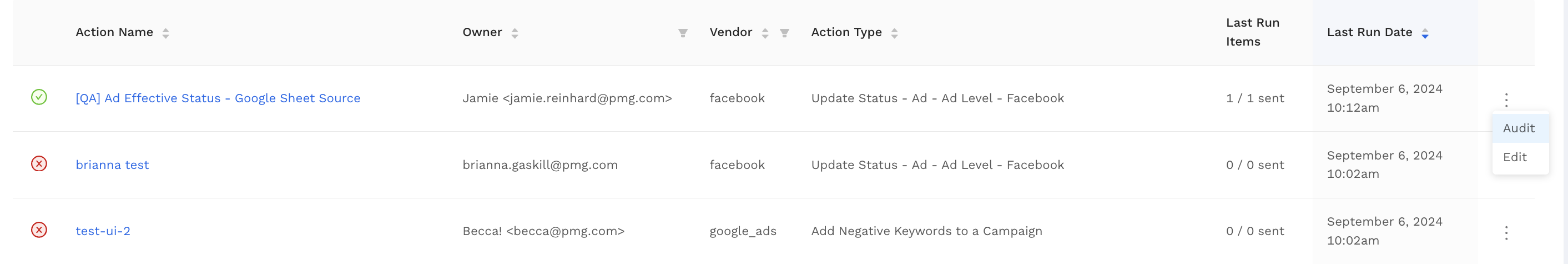 If an Action has had a successful run, a green checkmark will appear to the left-hand side of its name. Actions are automatically ordered by most recent run date.