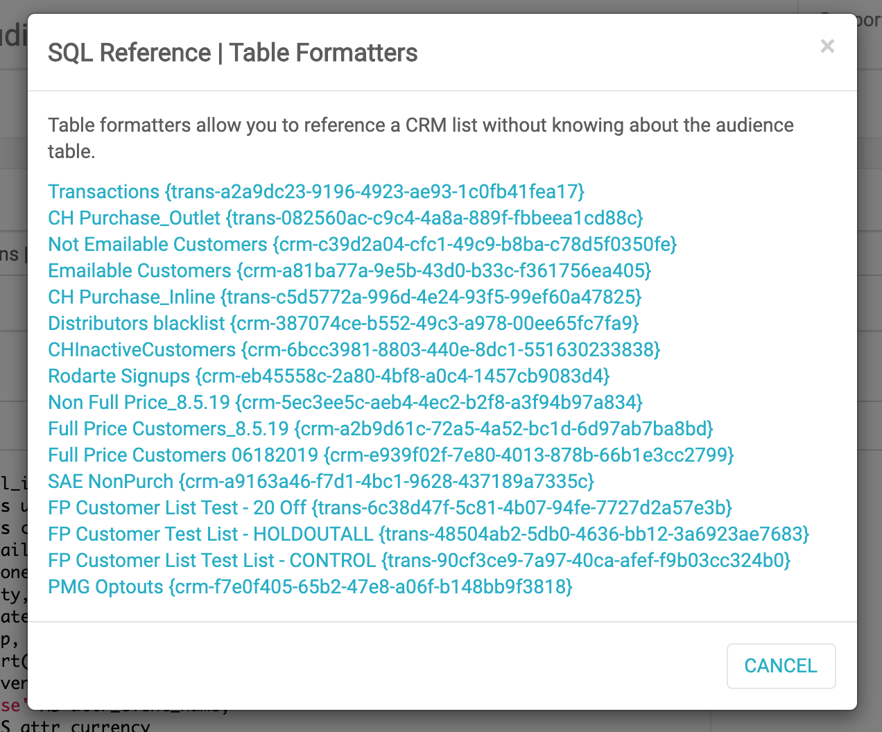 When clicked, this button will pop up a window that displays your client's audience lists, and the tables in which their respective data is stored. Go ahead and click the button. You should see something similar to this: