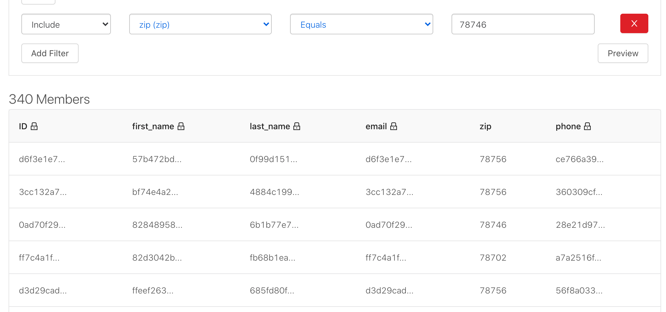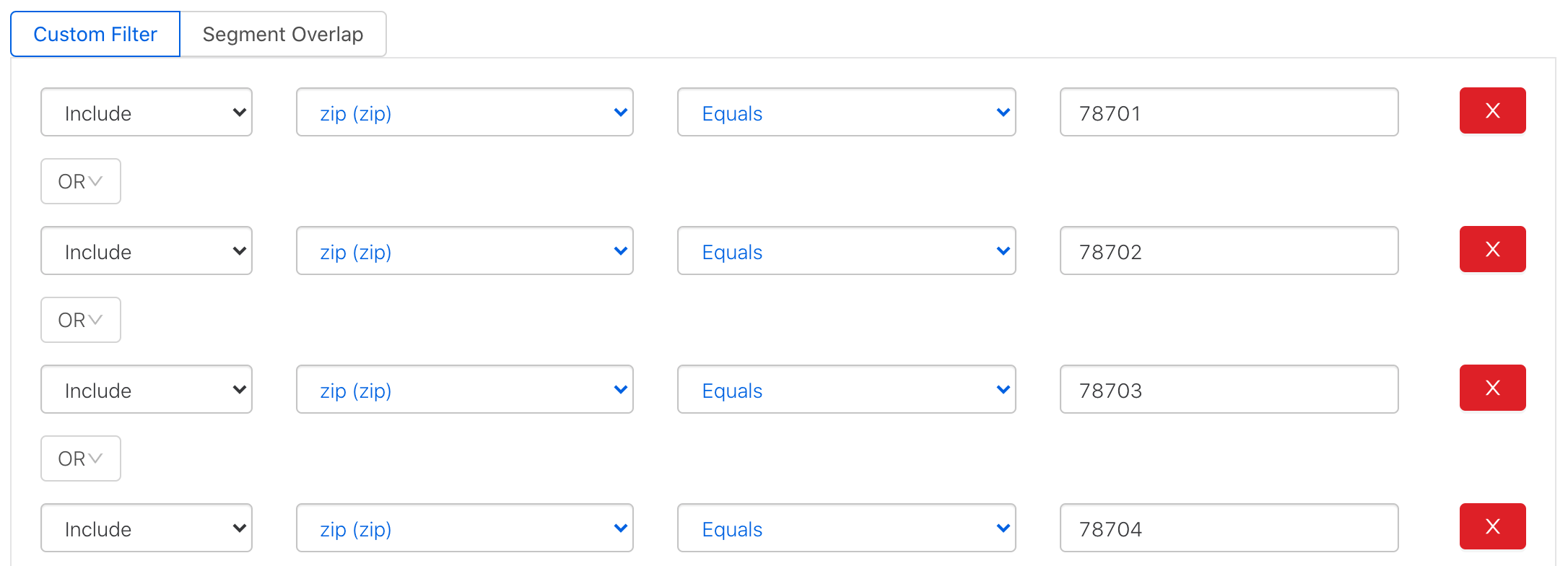 In this case, the only non-hashed field is zip code, so we will create a segment to target customers in Austin, TX using the area’s zip codes with a series of 'Include' filters.