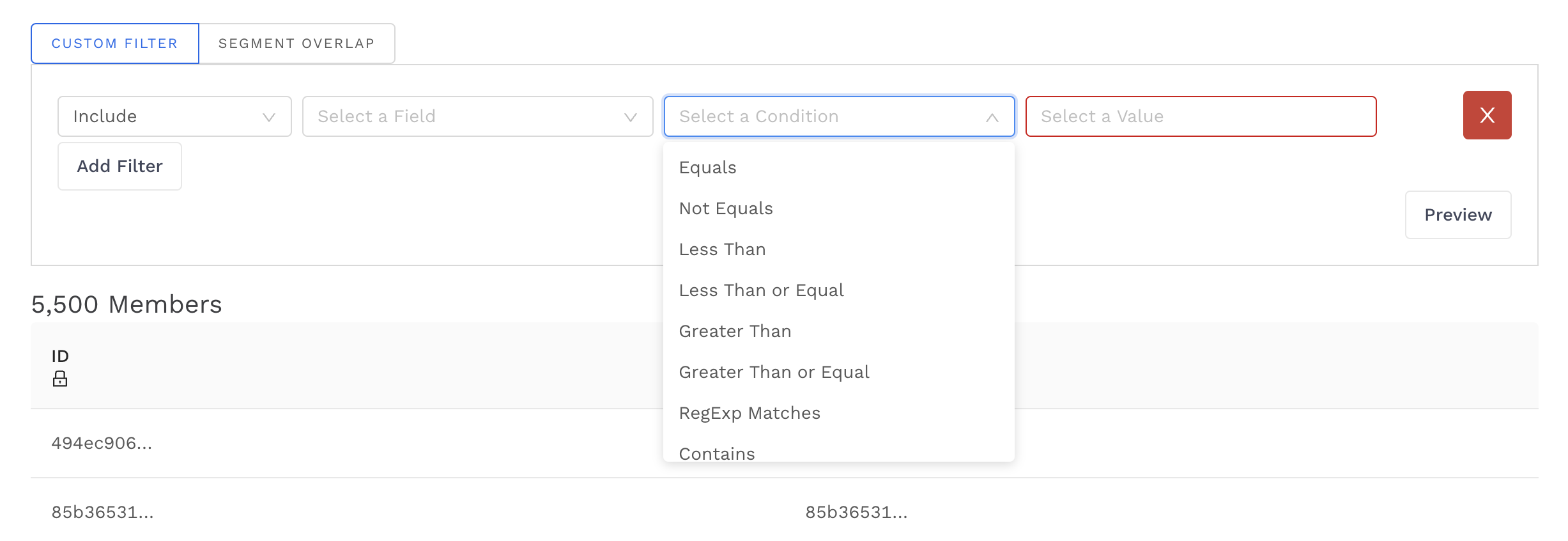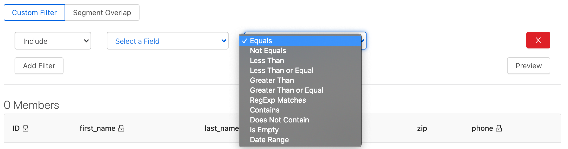 Filters can be applied to any column in your Audience list. You can filter to include or exclude specific customers based on the following conditions.