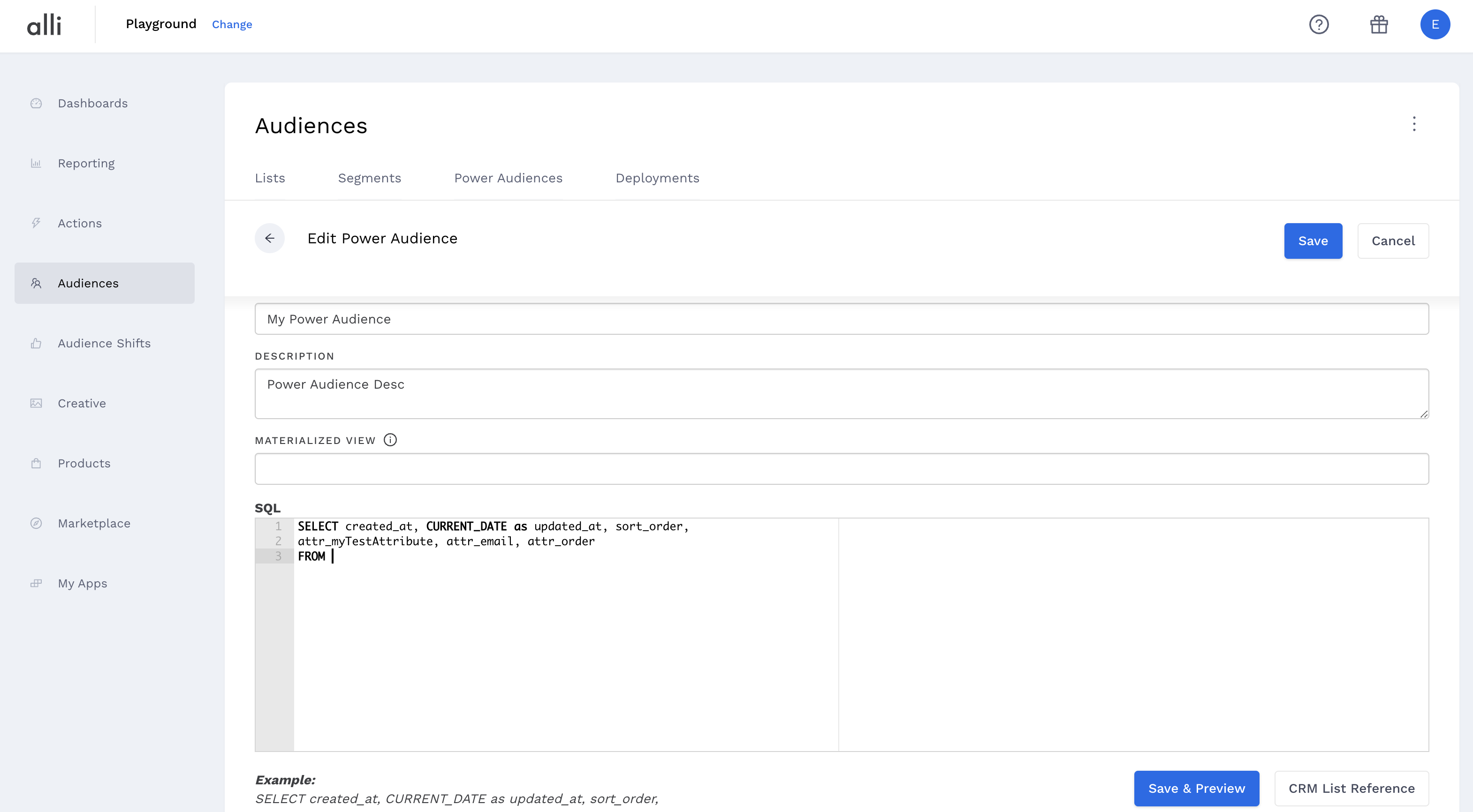 Enter the SELECT clause of your SQL (or any/all clauses except the tables you need to select from) NOTE: sort_order must be present in the outer SQL statement and each attribute defined in the audience (except created_at and sort_order) should be prefixed by “attr_”