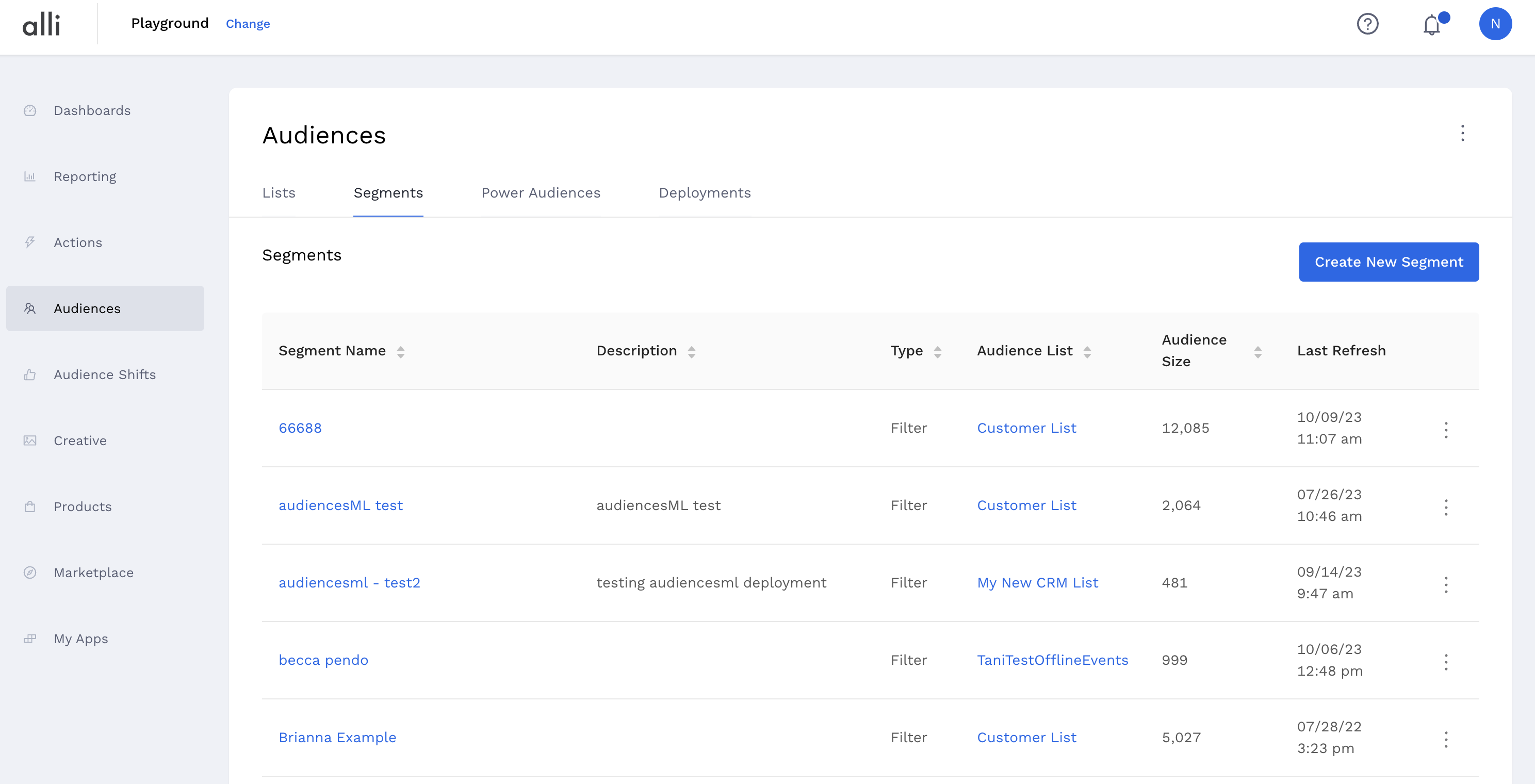 In either the lists, segments, or power audiences tabs, select the three dots next to the name of the audience.