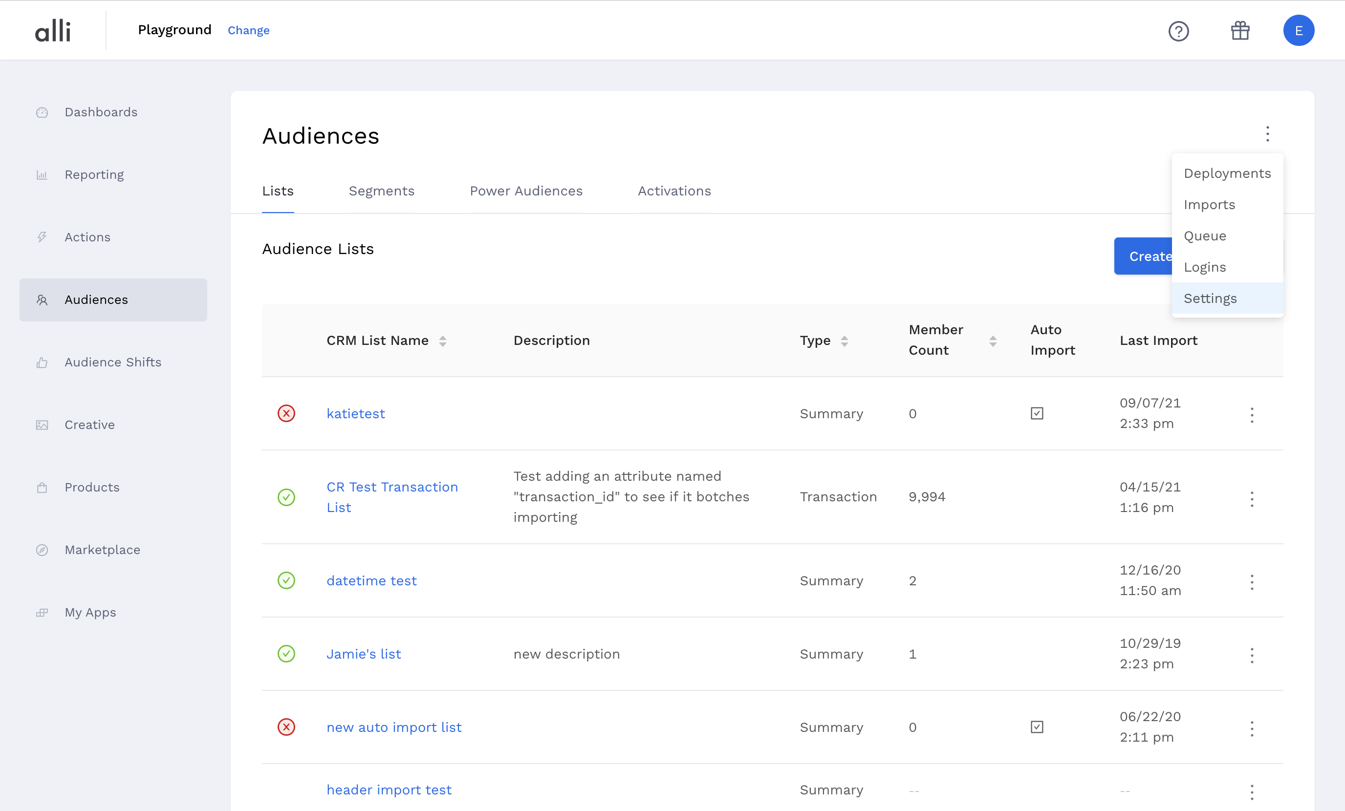 Navigate to the Settings page in Alli Audiences - you can find this page by clicking the three dots up the top right