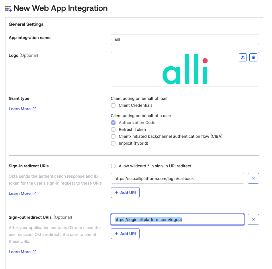 Under Sign-in Redirect URIs enter https://sso.alliplatform.com/login/callback as the redirect URI. If desired, you can enter a logout URI as https://login.alliplatform.com/logout.