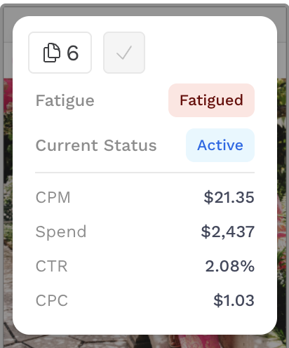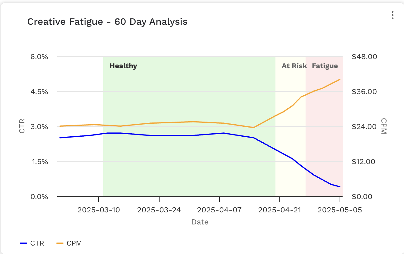 Creative Fatigue identifies when an ad’s performance begins to decline compared to how it performed when it first launched. Detecting fatigue early helps you refresh creative assets before efficiency drops and results worsen.