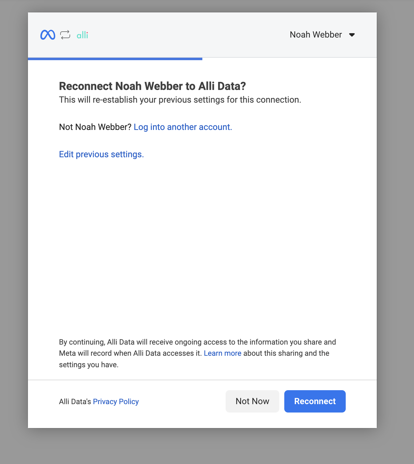 Click ‘Continue as {your name}’ in the Facebook authorization popup. This popup will close once you click. If on the reconnect page, click ‘Got it’ on the next screen to close the popup.