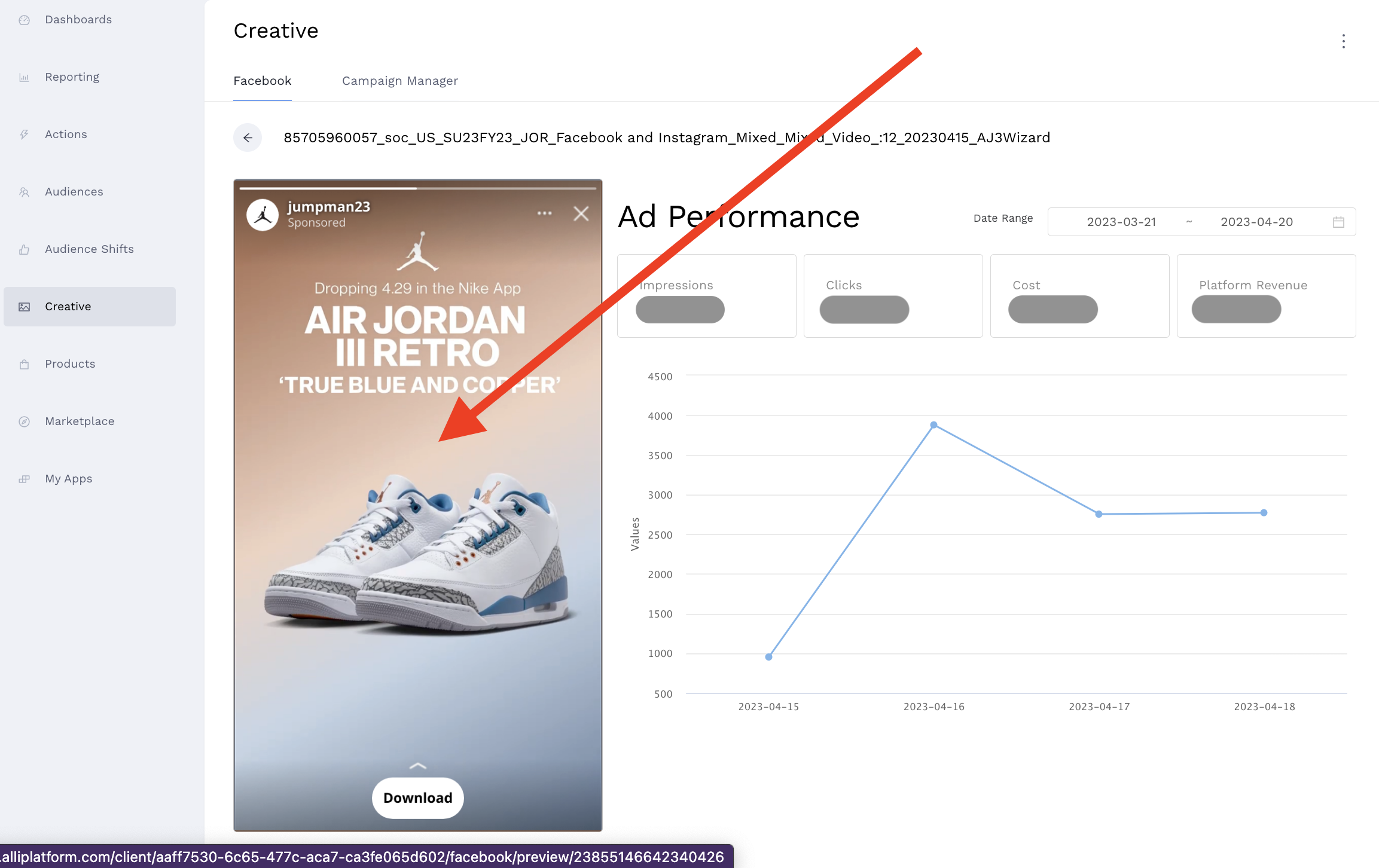 ** Note (Meta only): Replacing preview with image will show you the screenshot Creative Insights stores in the database, as opposed to the dynamic, interactive view that preview will return **