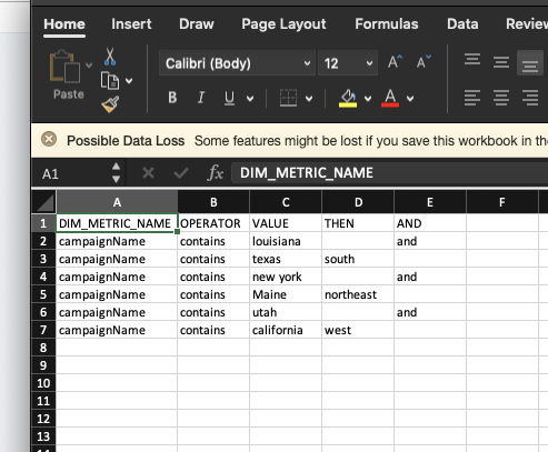 I have a bulk upload file that will look at campaign names in a report and give a new value where the campaign name is active on.