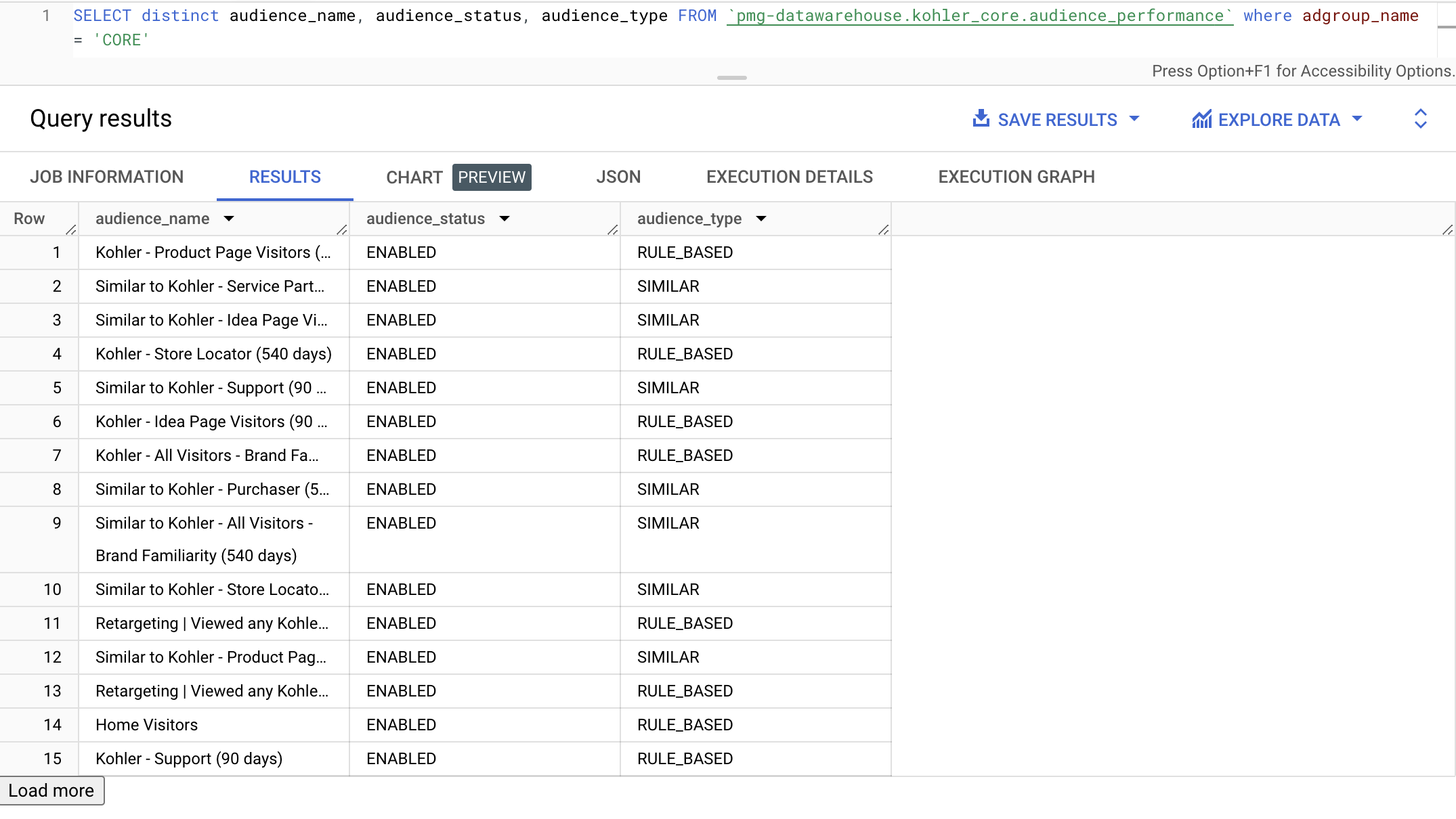 Example: The audience names, audience status, and audience types is shown for the CORE adgroup for Kohler