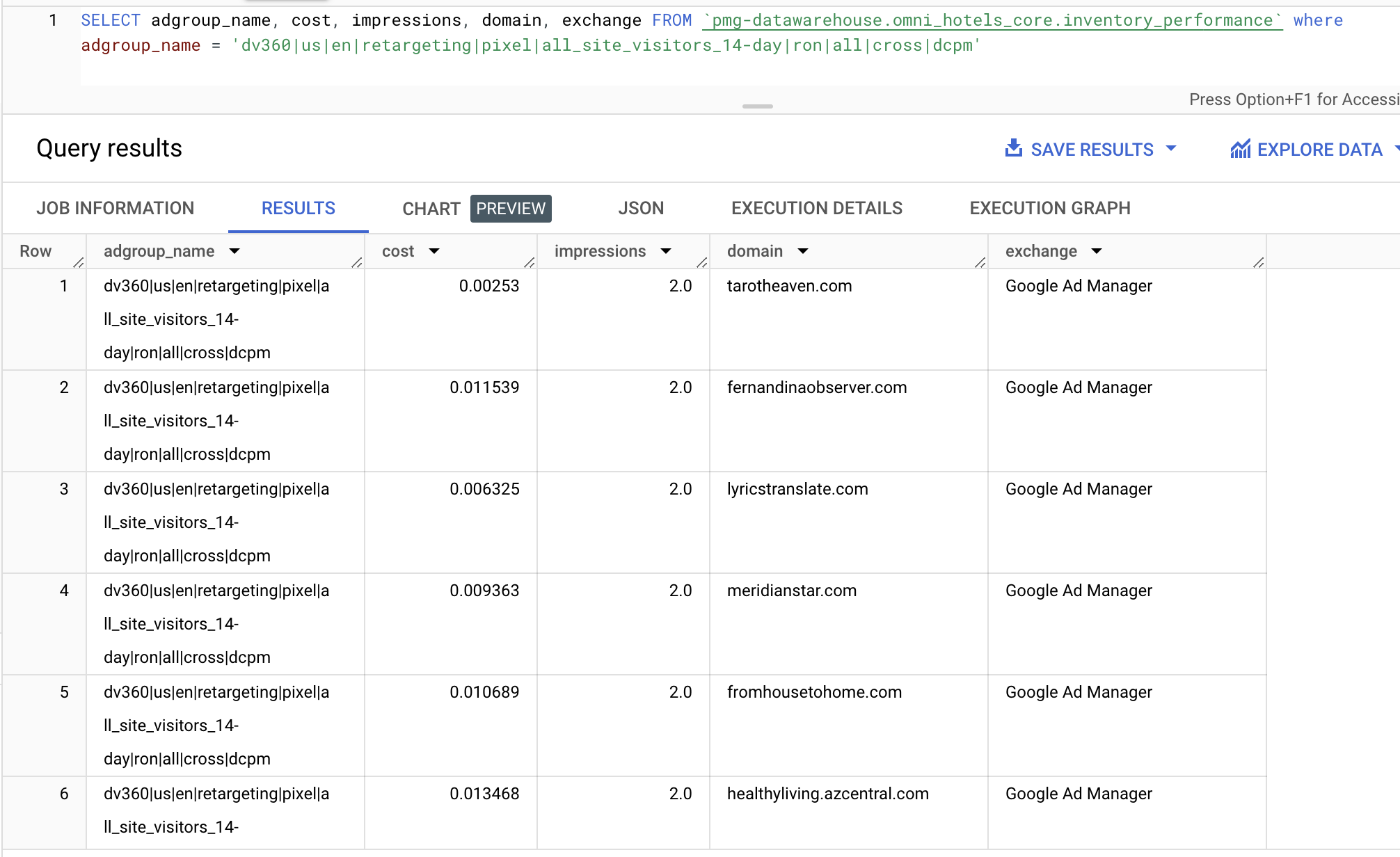 Description: A display channel, adgroup level report focused on gaining performance insights on the client’s different group placements. Each record or row in this report contains daily metrics and attributes for inventory/placement segmented by adgroup