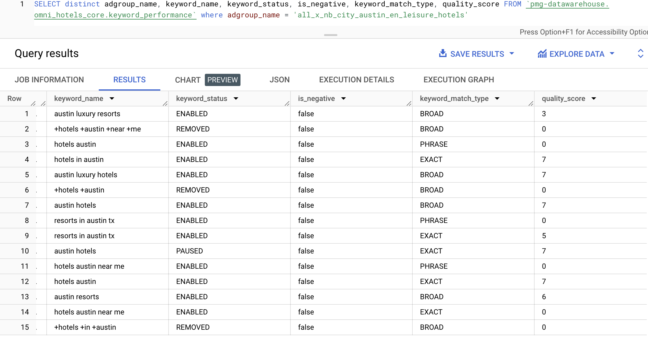 Description: A search channel, adgroup level report focused on gaining performance insights on distinct keywords used in the client’s marketing campaigns. Each record or row in this report contains daily metrics and attributes for a keyword segmented by the adgroup