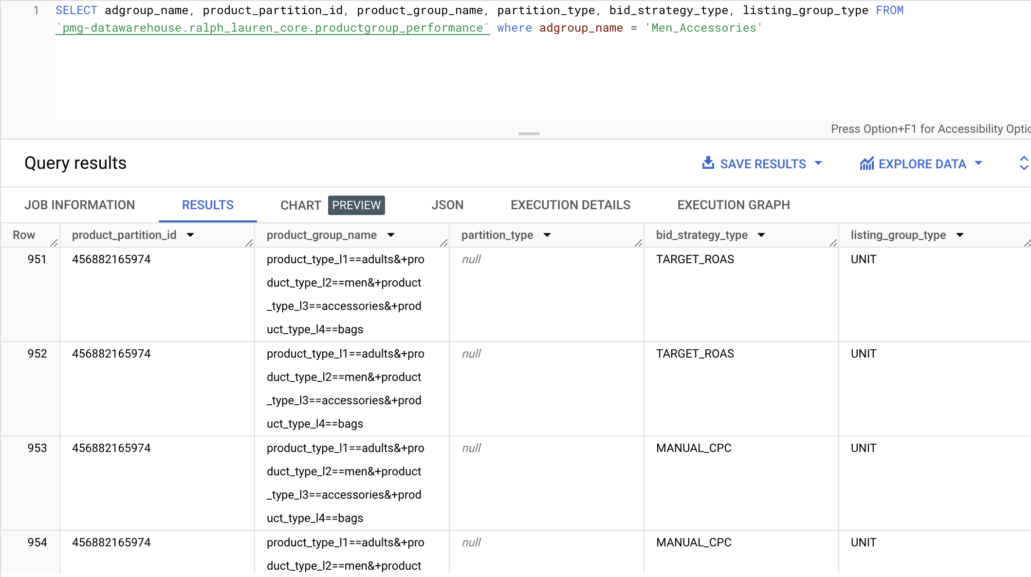 Description: A search channel, adgroup level report focused on gaining performance insights on the client’s different group product groups. Each record or row in this report contains daily metrics and attributes for a product group segmented by adgroup