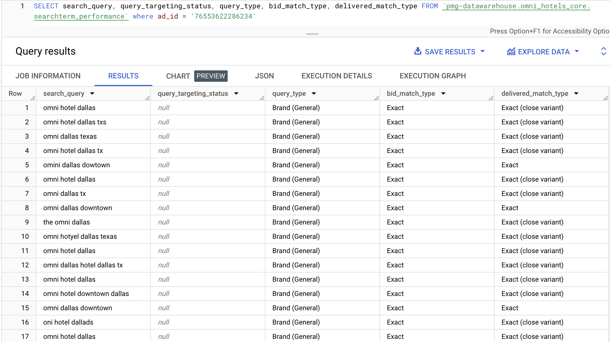 Example: Search term attributes for a specific Omni Hotels ad