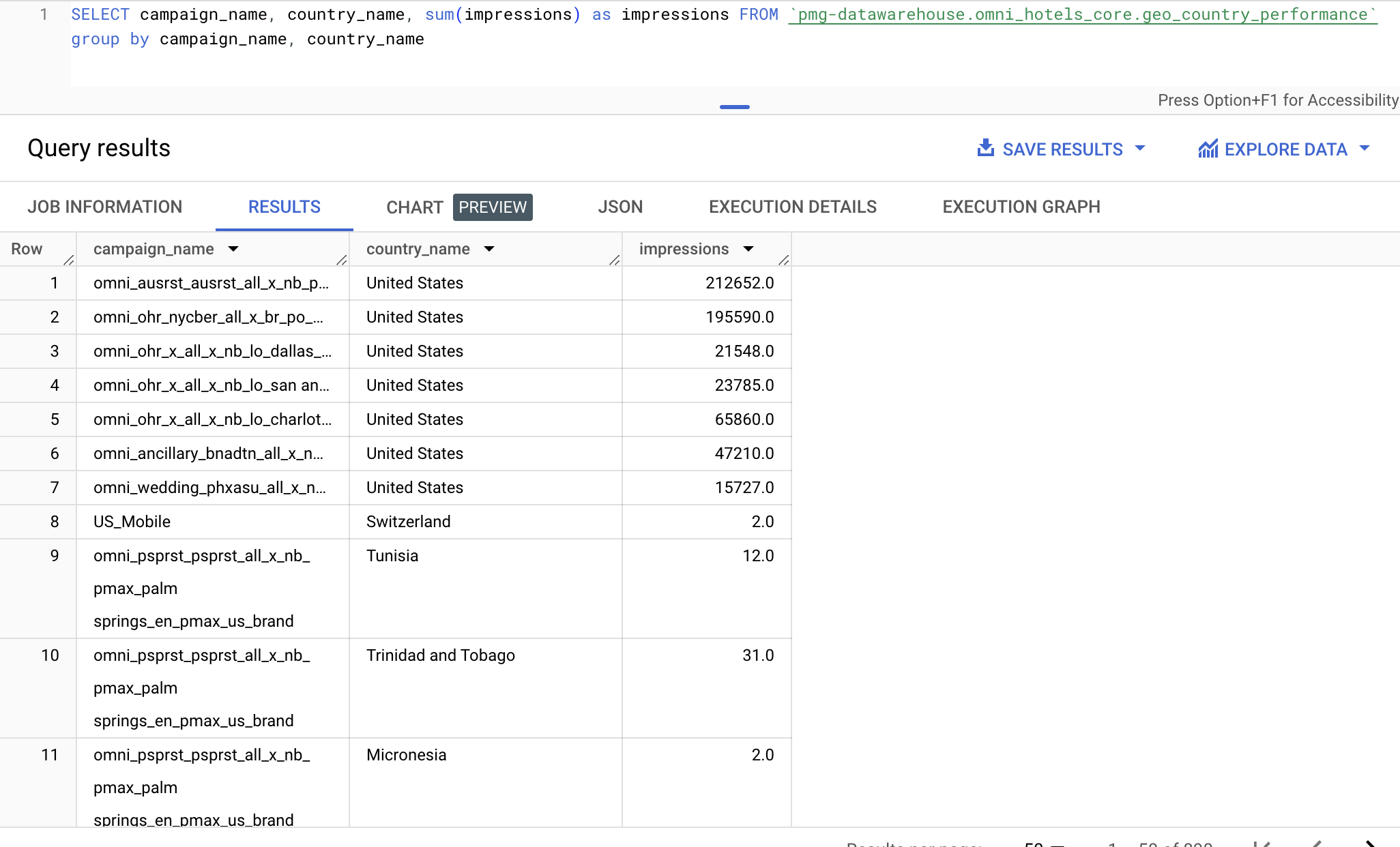 Example: Country specific metrics and performance for Omni Hotels campaigns