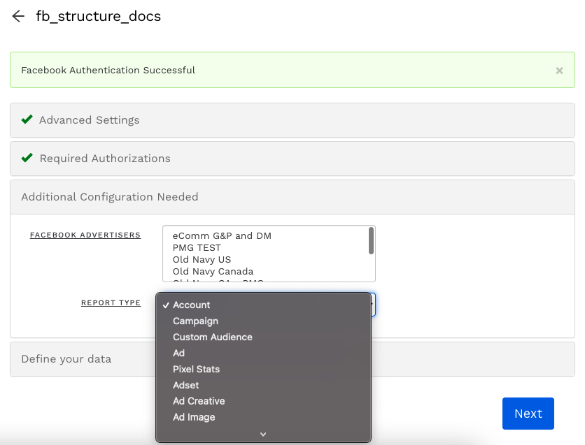 The next step is to select the Facebook Advertiser(s) name and report type from the Additional Configuration Needed section. You can select multiple advertiser names by holding down the CTRL (⌘ on mac os x) key.