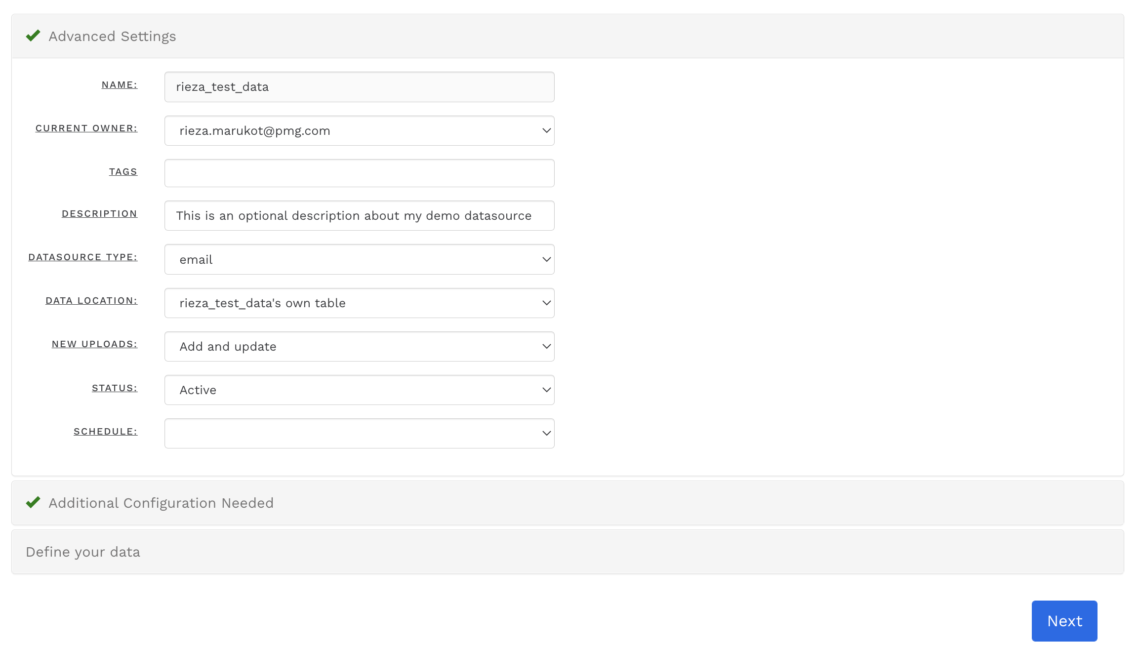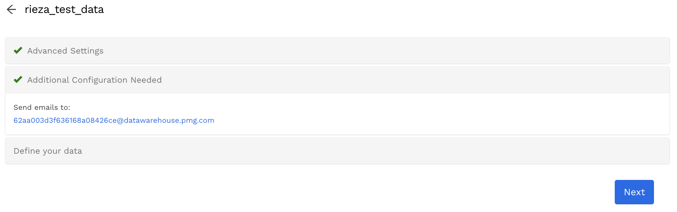 Select Additional Configuration Needed. This will be determined by the type of datasource that you are using. Because we selected ‘email’ as the Datasource Type, you will see the email address where data needs to be emailed as an attachment. In this example, data will be emailed to 62aa003d3f636168a08426ce@datawarehouse.pmg.com.