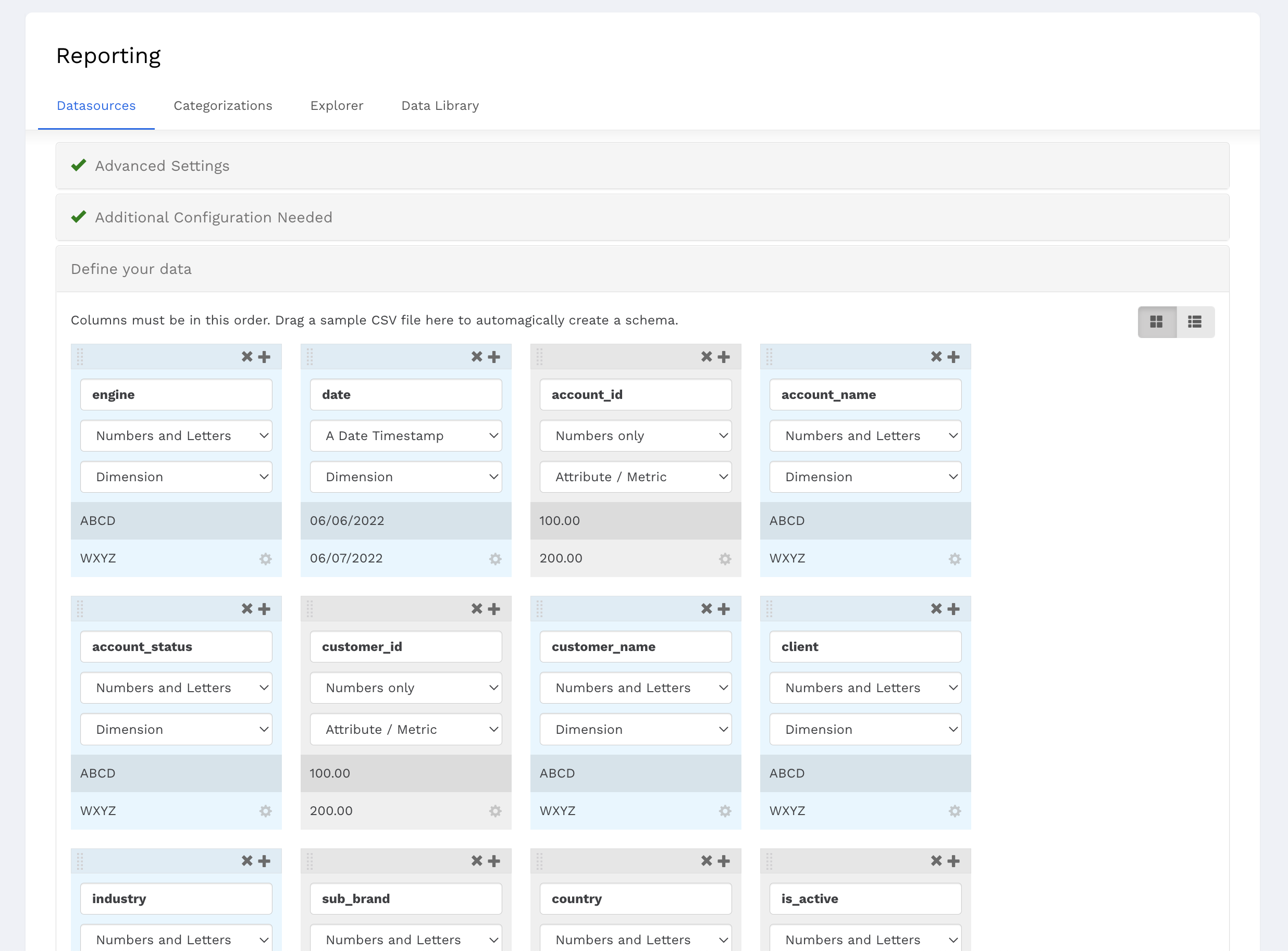 Click Next to continue setting up the datasource. In this last step, you will need to define your data. To automagically create the schema, you can drag a sample CSV file into this section. Click Save to complete the setup.