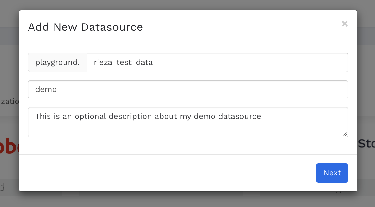 The name of your datasource is preceded by the name of your customer. In this example, you will see that [rieza_test_data] is preceded by the ‘customer’ name [playground.] This means that the full name of your datasource would be [playground.katie_test_data] for future reference.