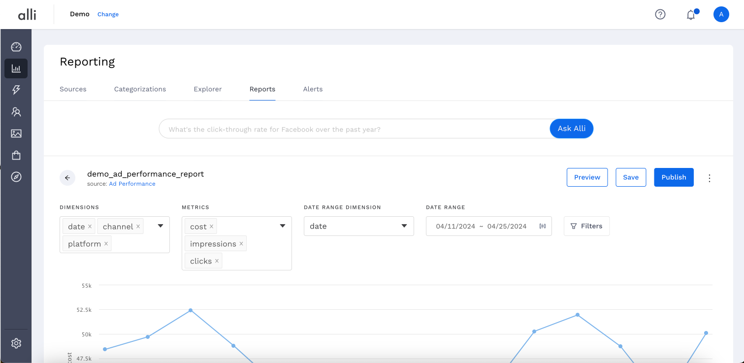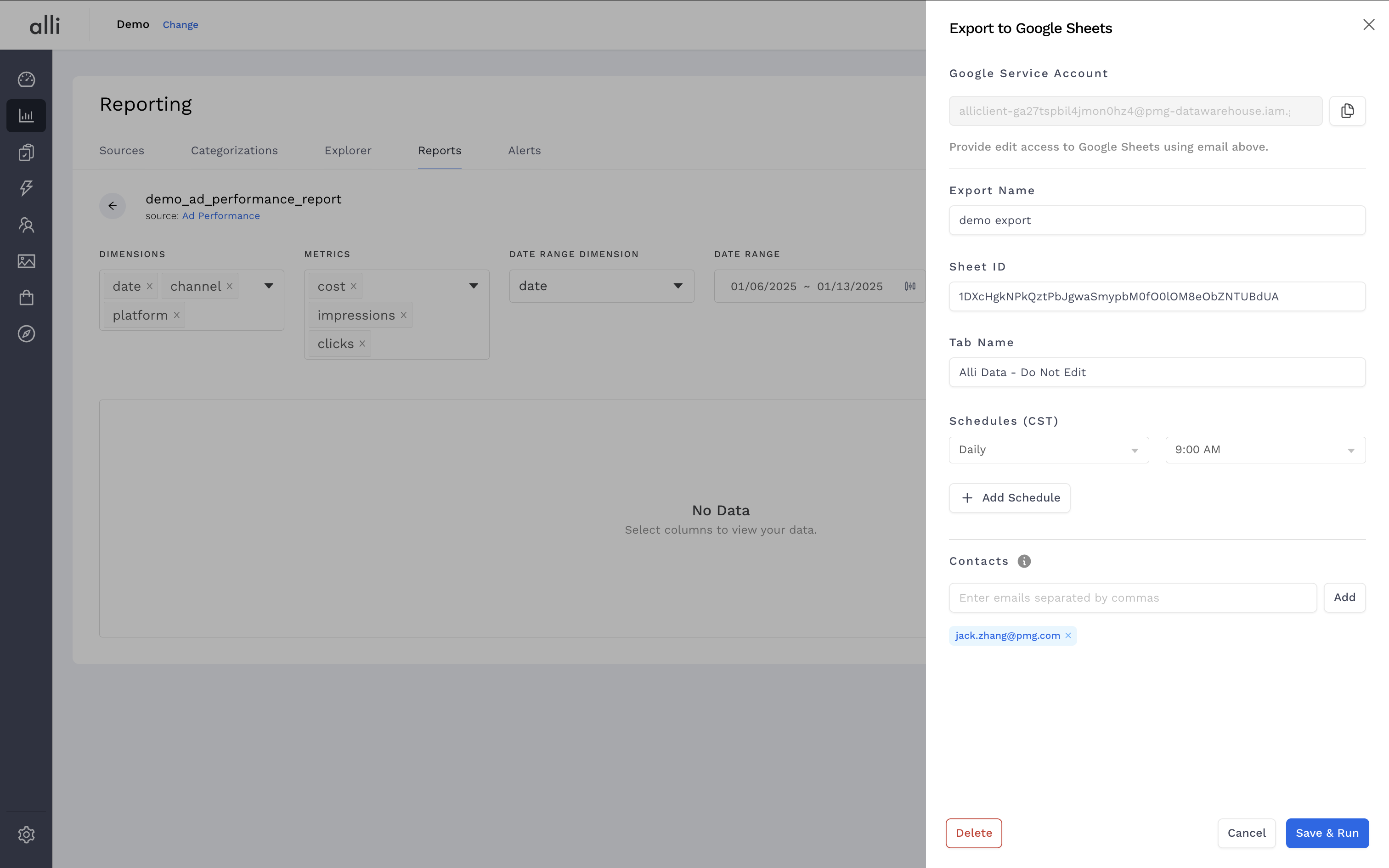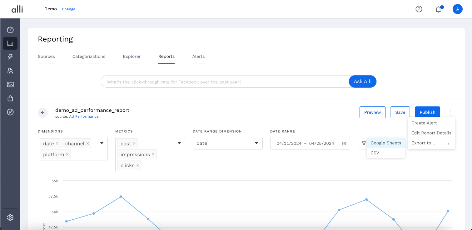 This guide explains the steps to create automated connections that send data stored in Alli to a Google Sheet. Within your Google Sheet, this data can be used for any data needs such as reporting, pacing, and much more.