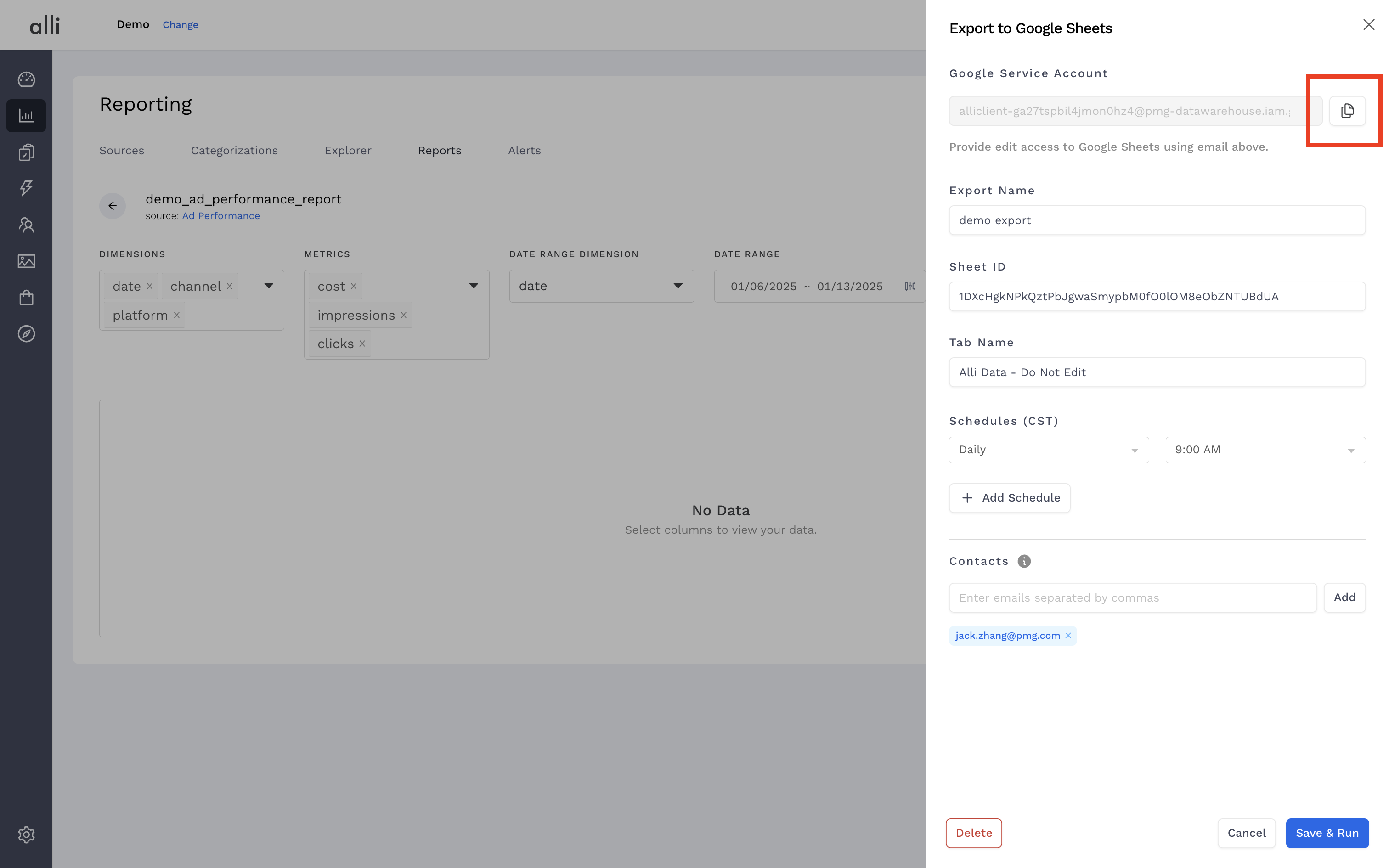 Copy the Google Service Account and add it as an Editor in your Google Sheet. This provides Alli access to write data to your Google Sheet.