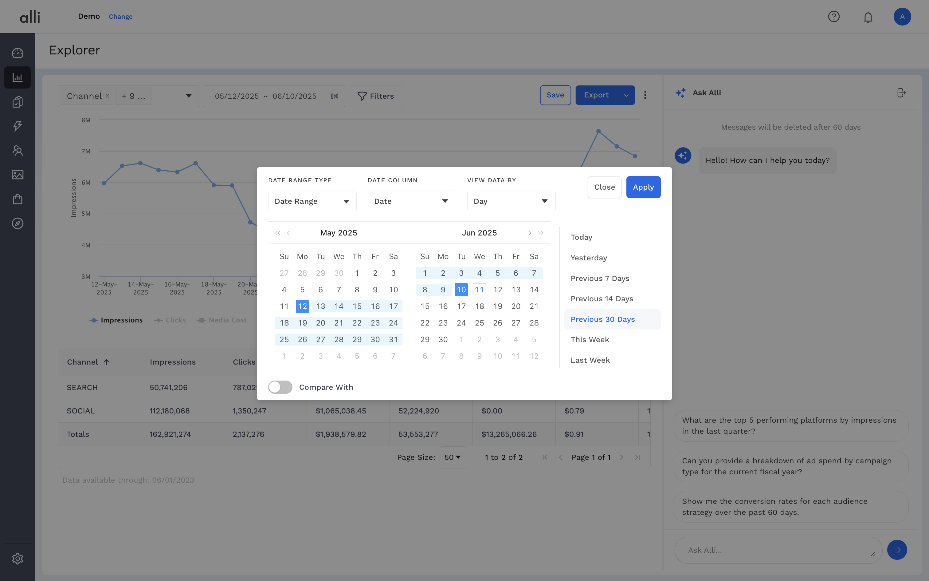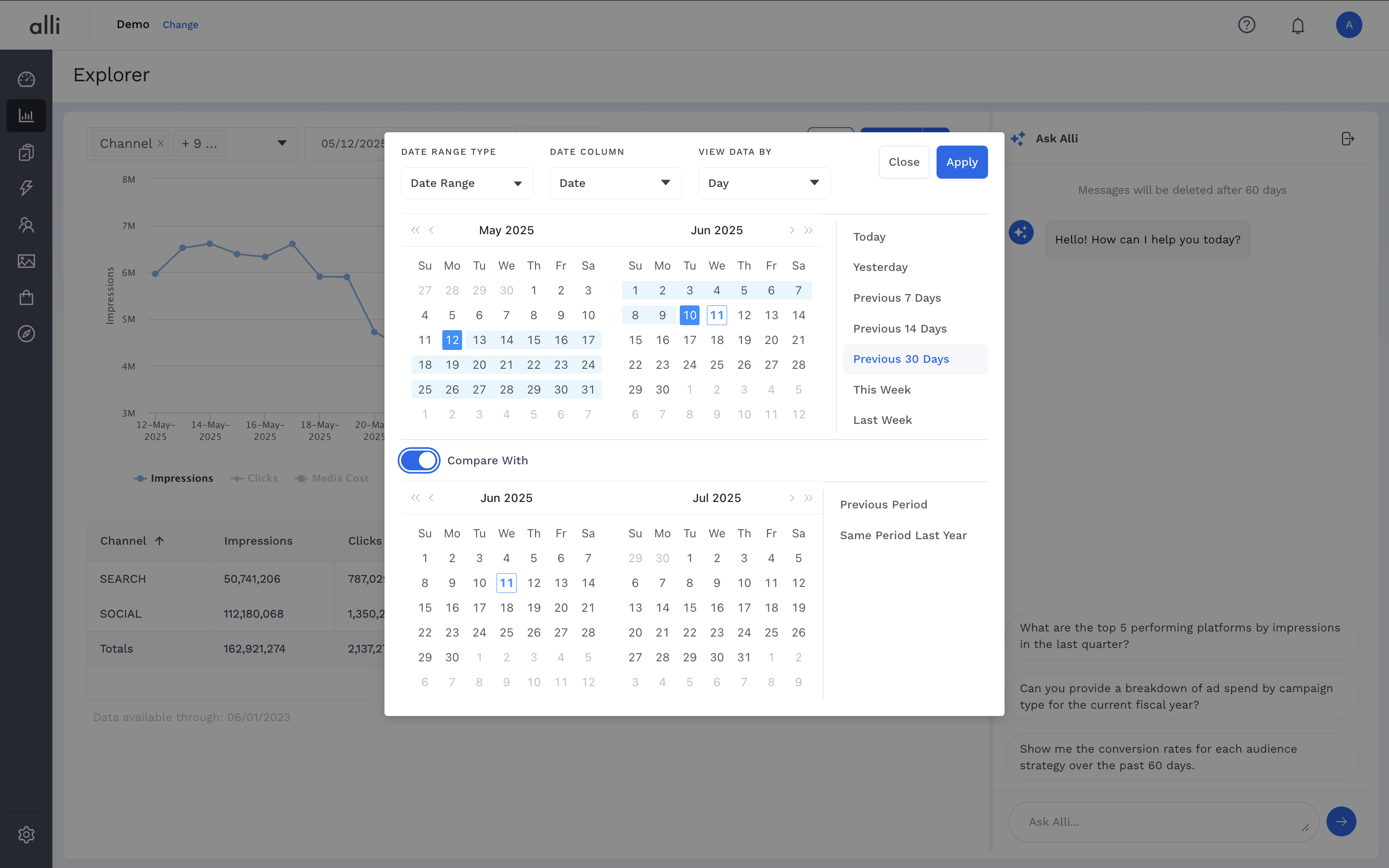 “Show me impressions by channel for the last 30 days compared to the previous 30 days.”