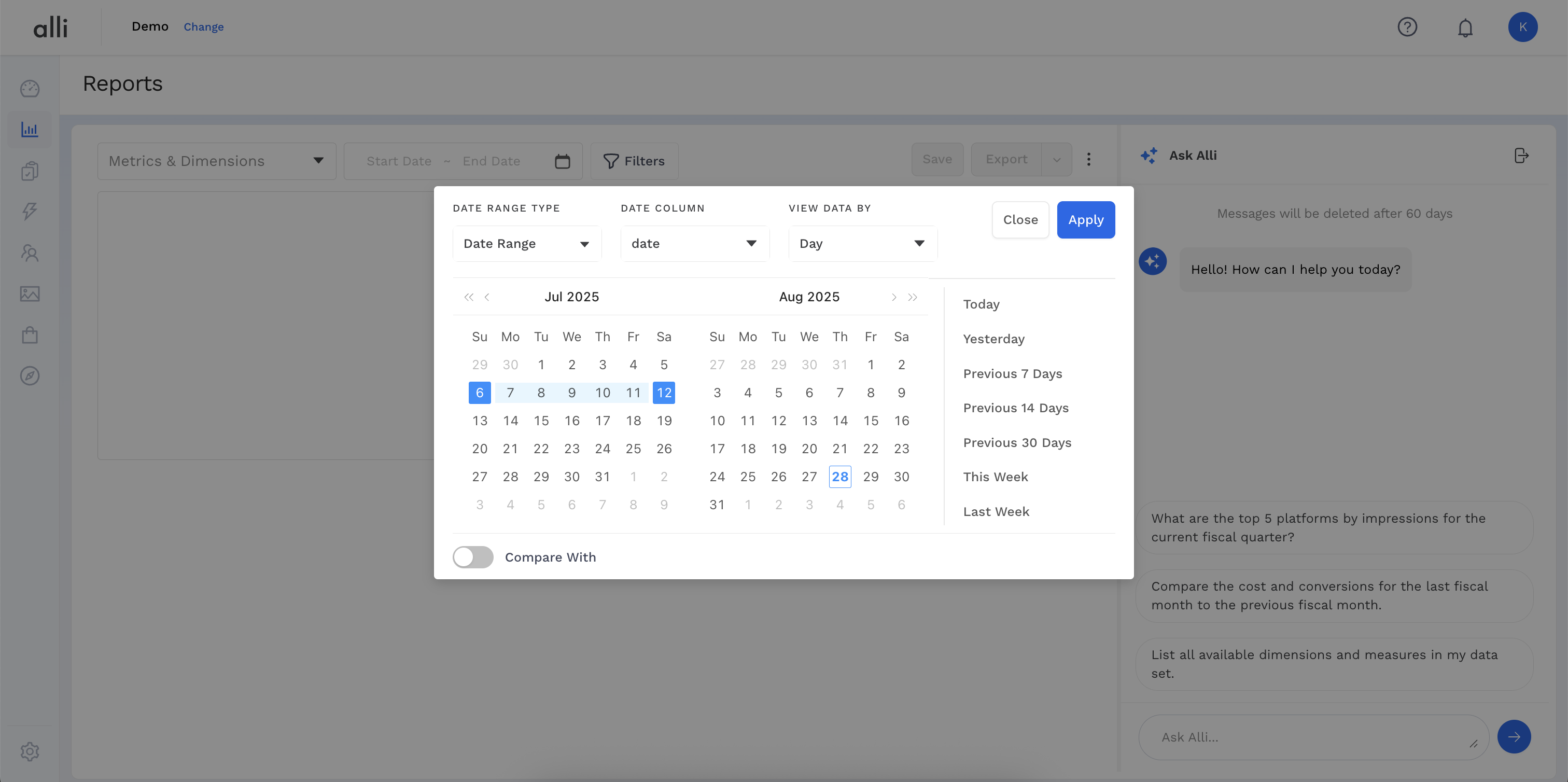 Select Date Range input and choose from one of the preset rolling date ranges on the right of the calendar. Click Apply and Preview to load results.