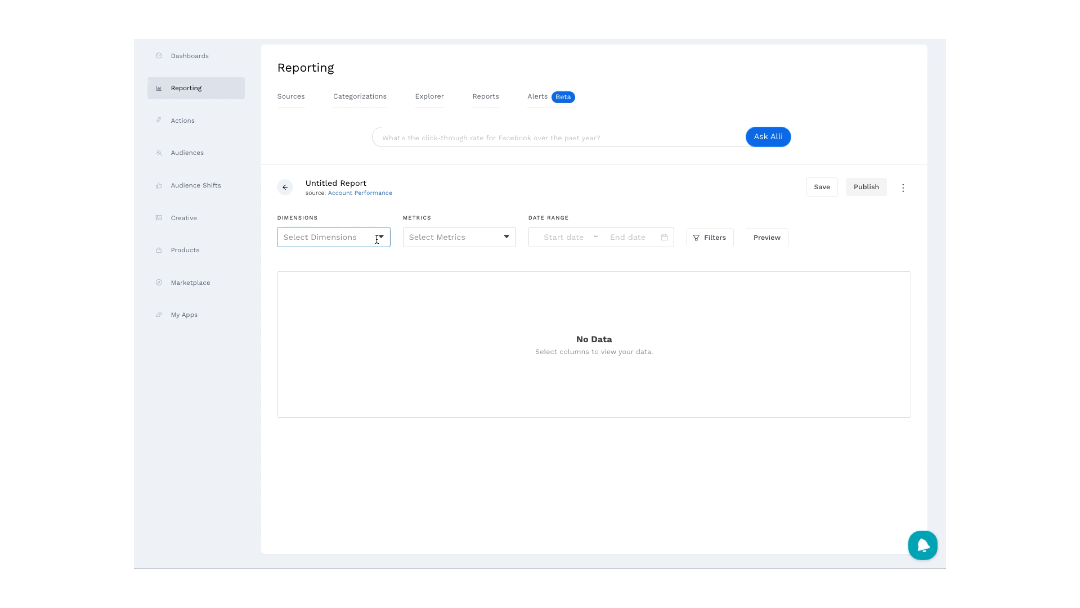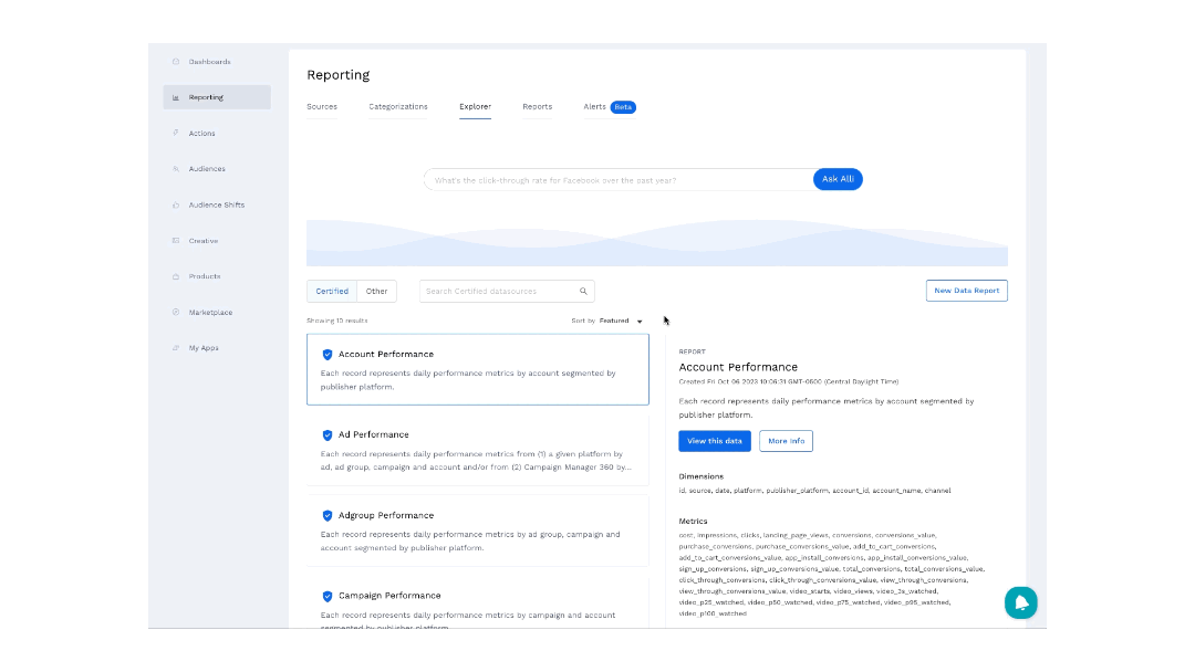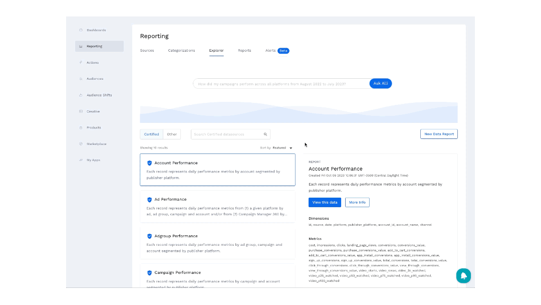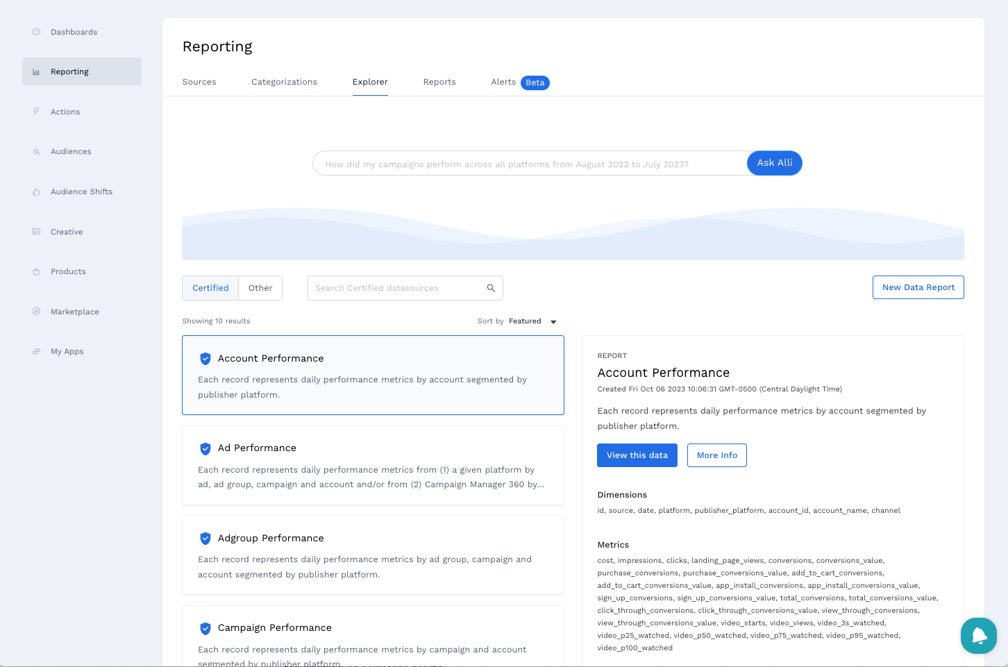 To get started with Explorer Reports within your Alli client, navigate to Reporting on the side navigation menu. Within the Alli Reporting application, navigate to Explorer on the sub-navigation menu. Here you can search for the data that you are interested in, explore the Alli Certified data that has been built for your client, and get started on your data exploration journey by leveraging Ask Alli.