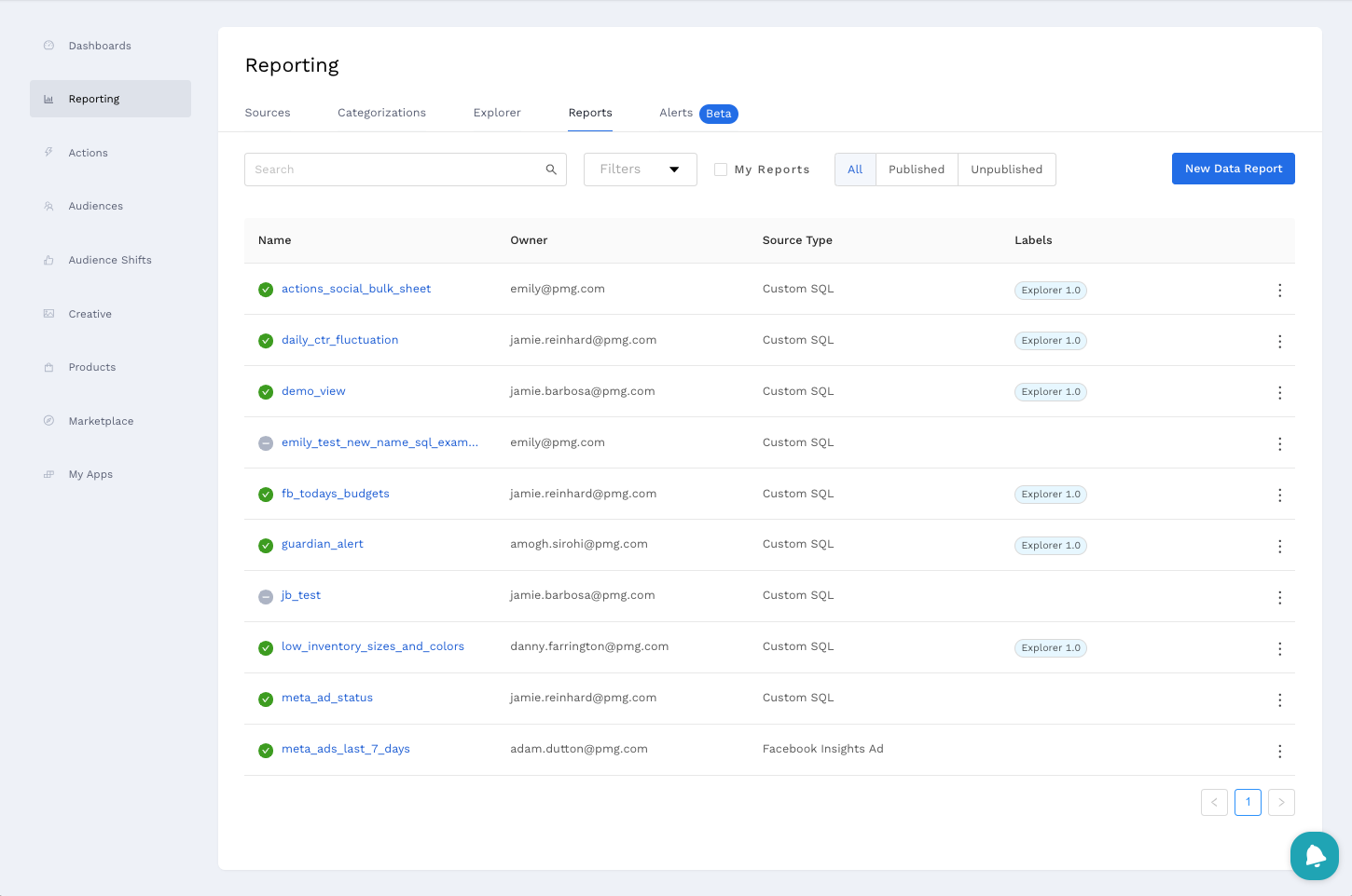 If you’ve already created a report and would like to go back to it to make updates, navigate to Reports on the sub-navigation menu. This page will list all the Reports that have been set up for your client. Here you can search for existing Reports, filter existing Reports by Labels, and see the current status of a Report.