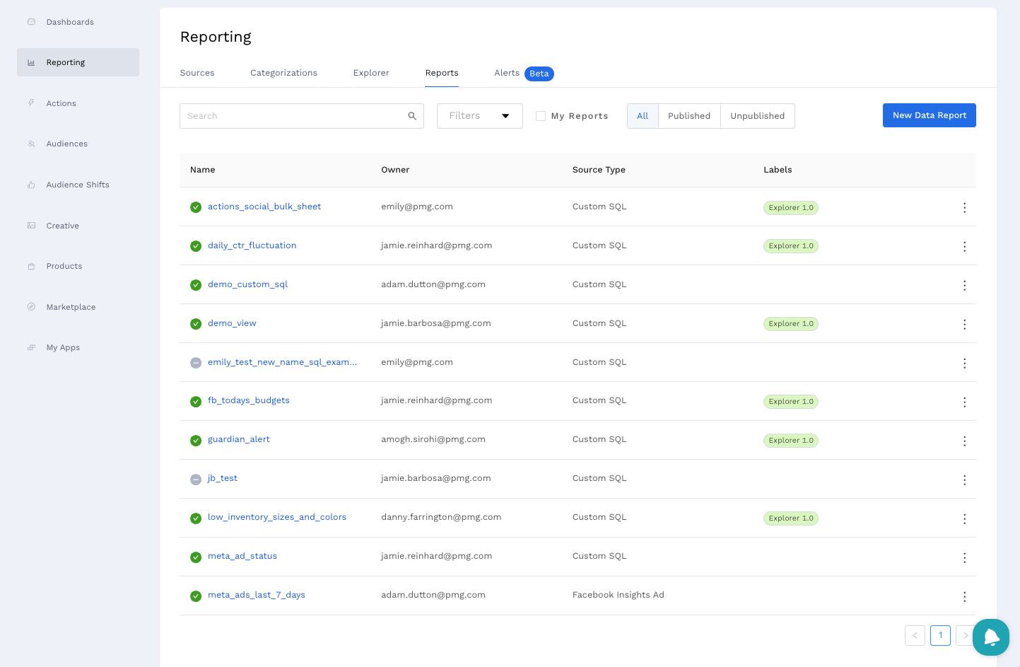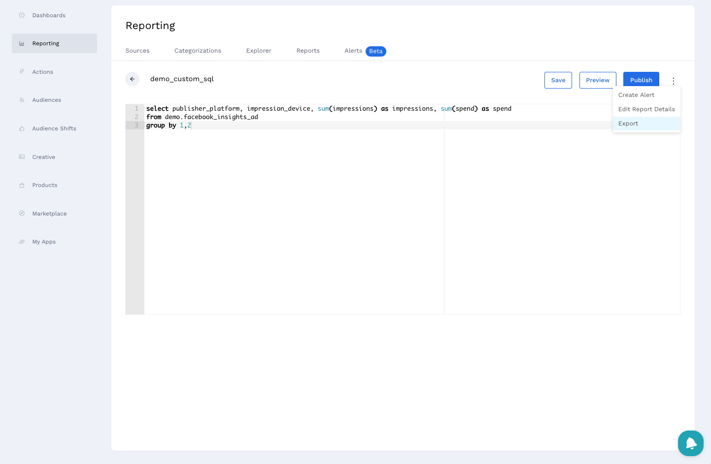 Within the SQL editor, add in your custom SQL referencing data from a datasource within your client. Be sure to include the client slug before the name of your datasource (ex. demo.facebook_insights_ad). When you are ready, click Preview to load the data. When you’re satisfied with your report you can click Save to name report which allows you to come back to it later. If you would like to use the Report elsewhere in Alli, click Publish to make it available.