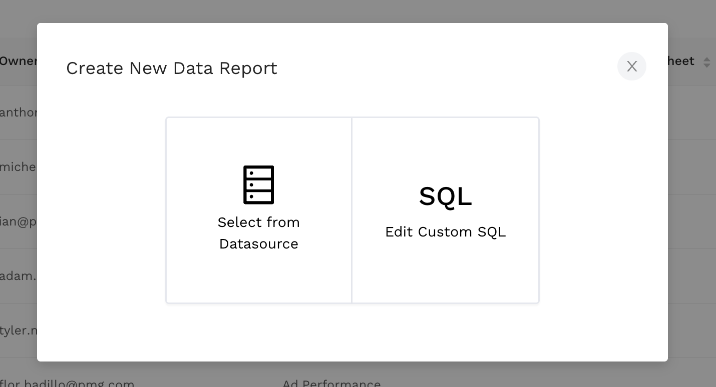 1.) Navigate to Reporting → Reports, click the New Data Report button, and select the Select from Datasource option