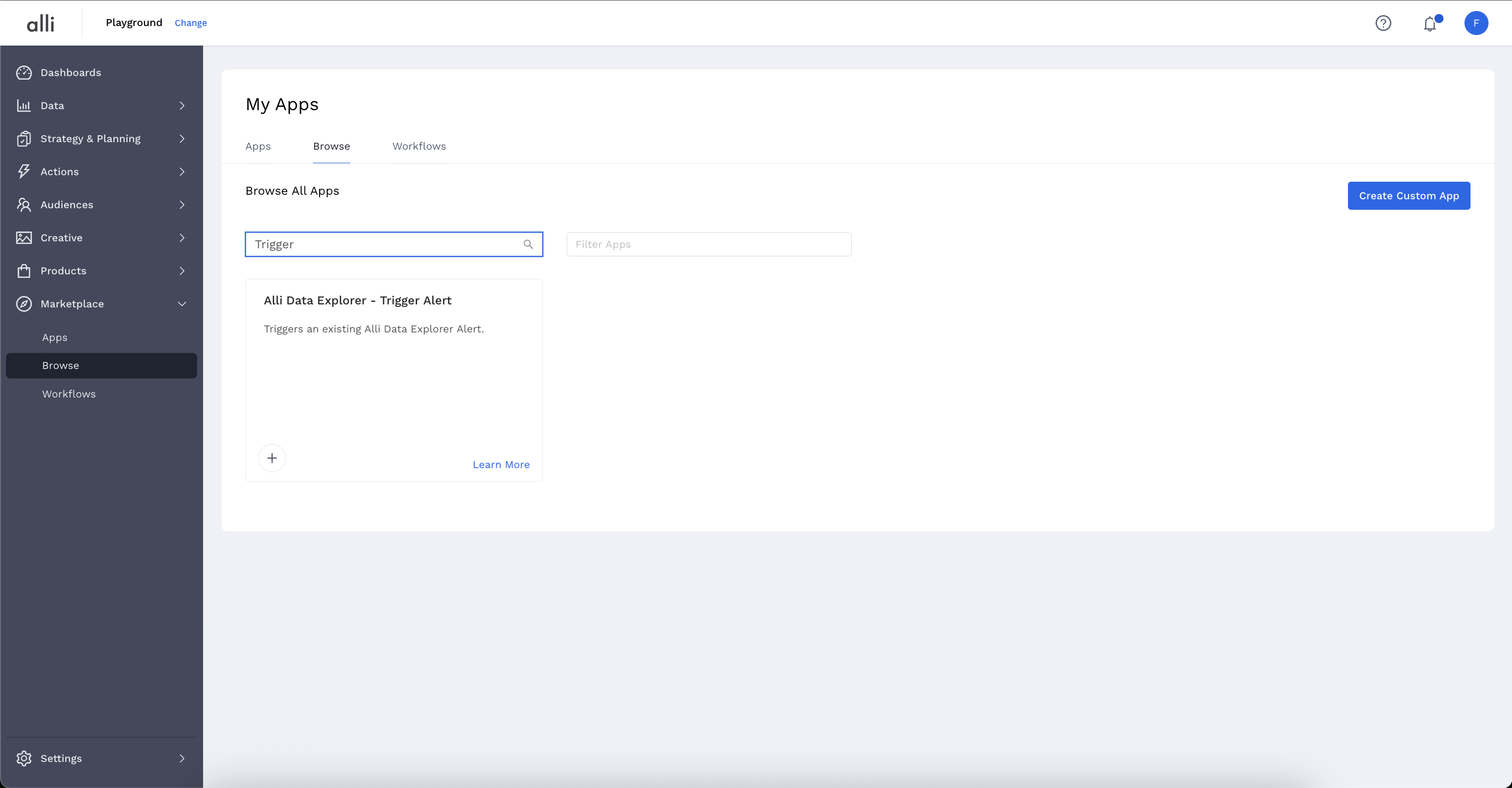 Next, navigate to Marketplace and install the Alli Data Explorer - Trigger Alert app.