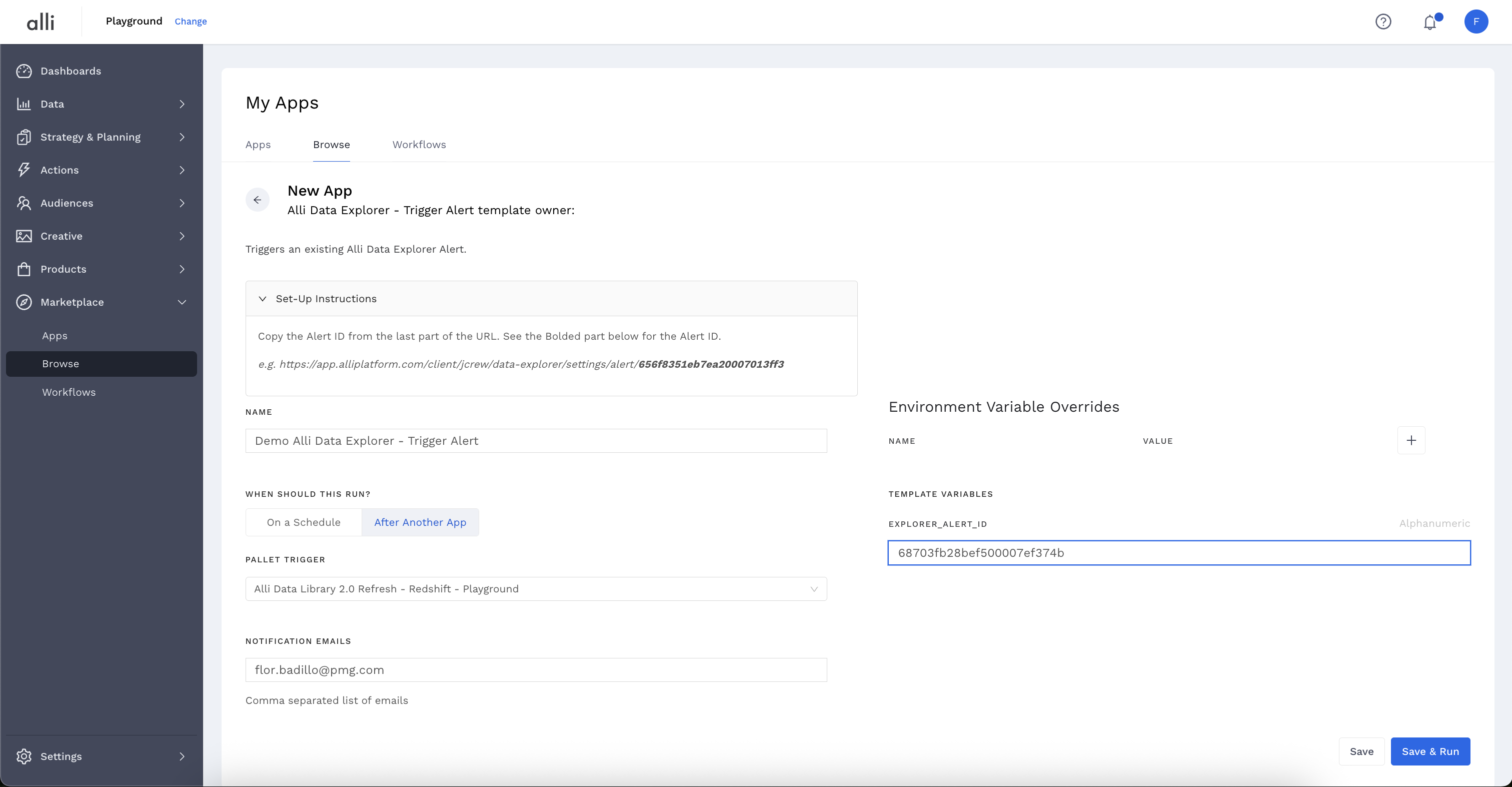 Lastly, provide a name, paste in your previously copied Alert ID, set the app to run after your Marketplace app that you wanted to be alerted from and hit save. In the example, the Alert will be triggered whenever the Alli Data Library refresh happens.