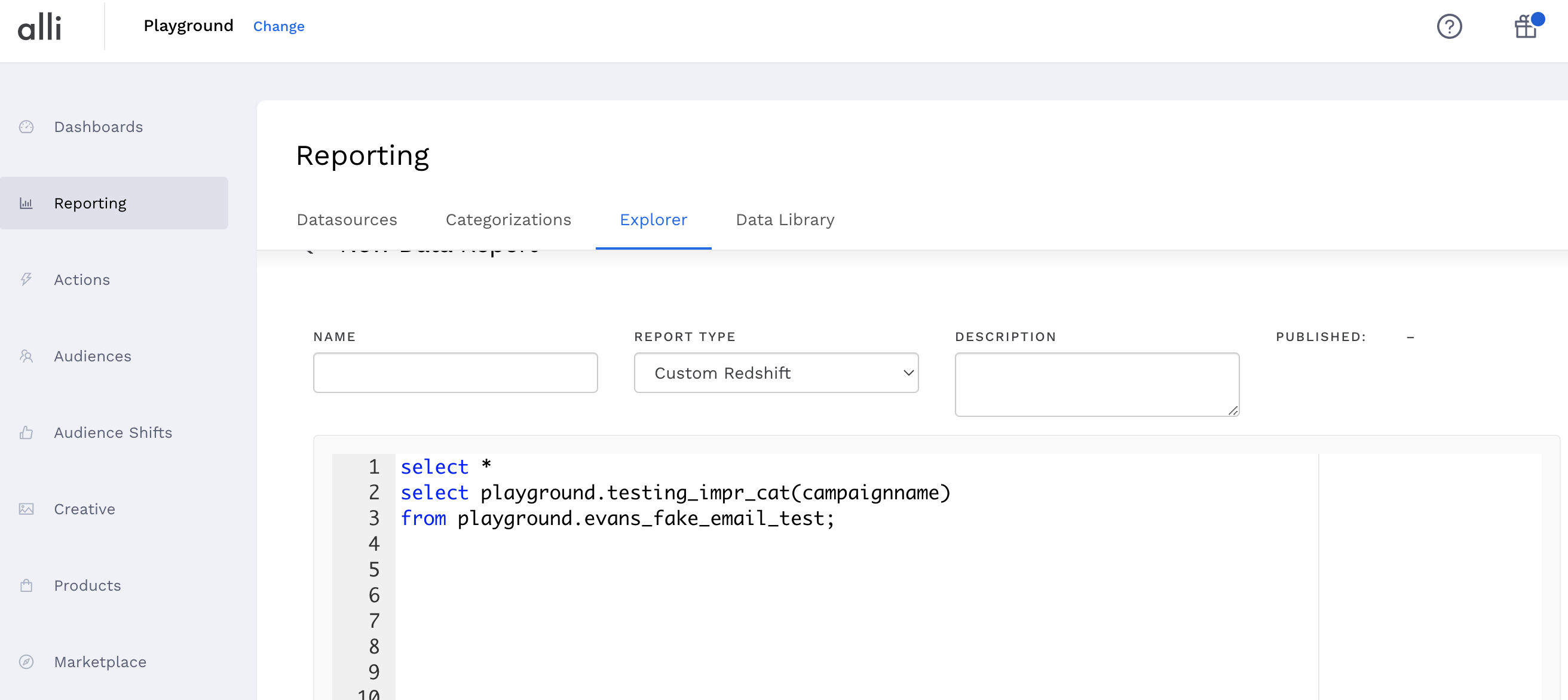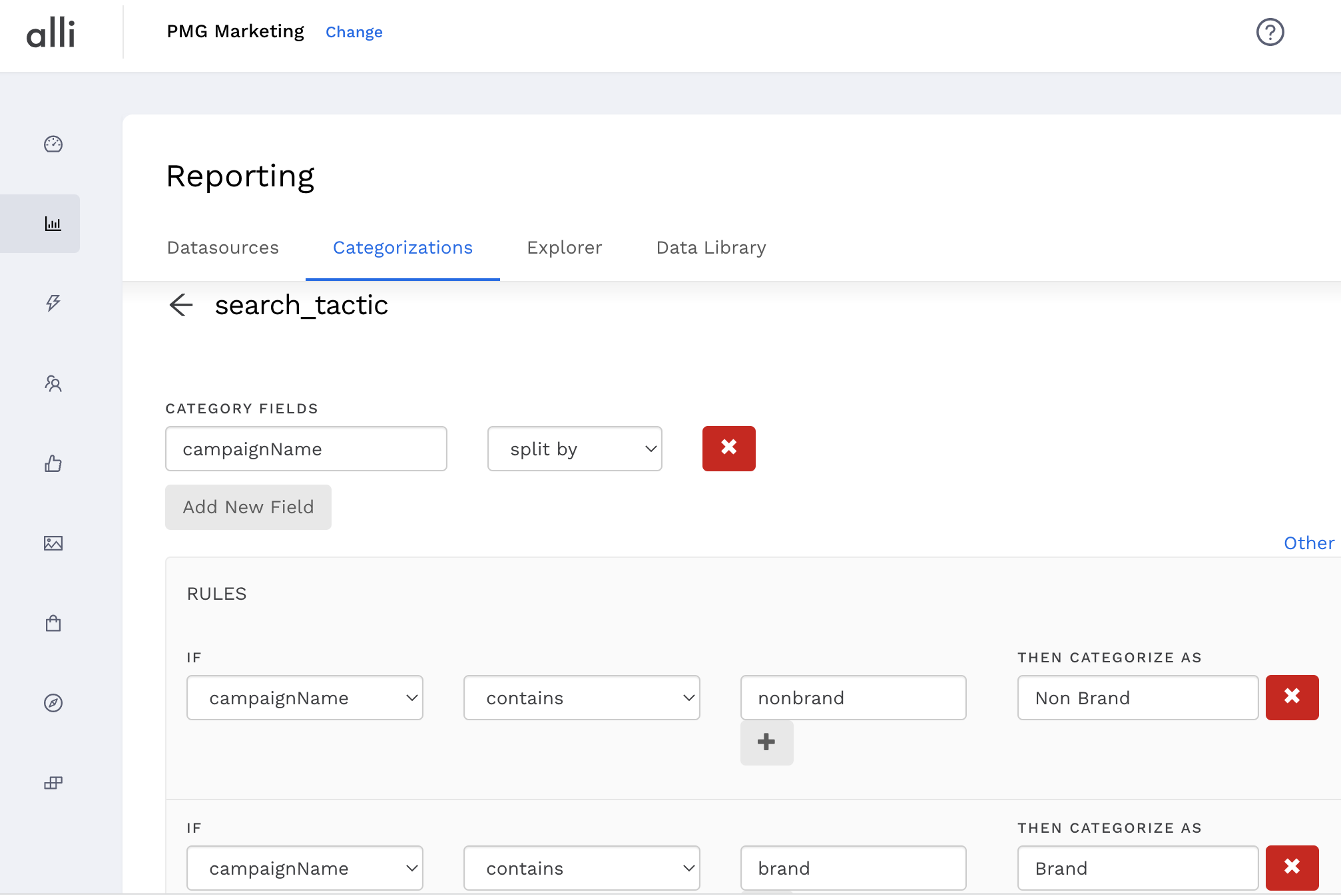The field name does not have to match the UI. Since the categorizations are not datasource dependent, you can use any datasource column.CODEselect pmg_marketing.search_tactic(campaignName) from pmg_marketing.datasource2; select pmg_marketing.search_tactic(campaign_name) as tactic, SUM(impressions) from pmg_marketing.google_ads GROUP BY tactic;If you click Preview on this SQL query, you will see the line items based on the user-defined values created in the Categorization. Check to make sure that your categorizations look correct. You are now able to see your published categorizations in your reports!