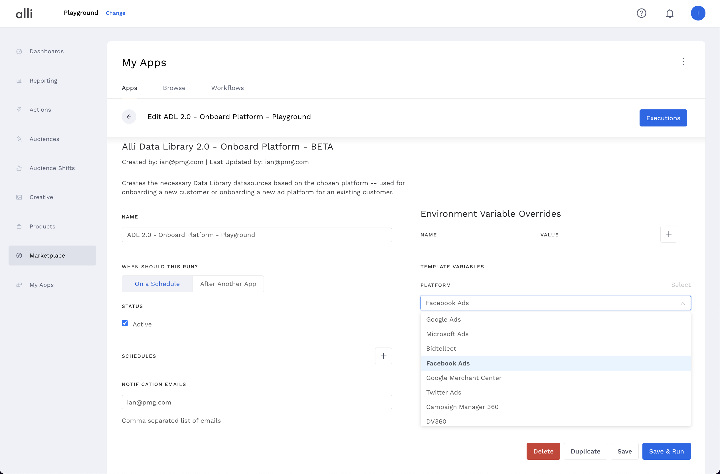 4.) Select Save & Run to execute the app. This will build the necessary datasources for the chosen platform.
