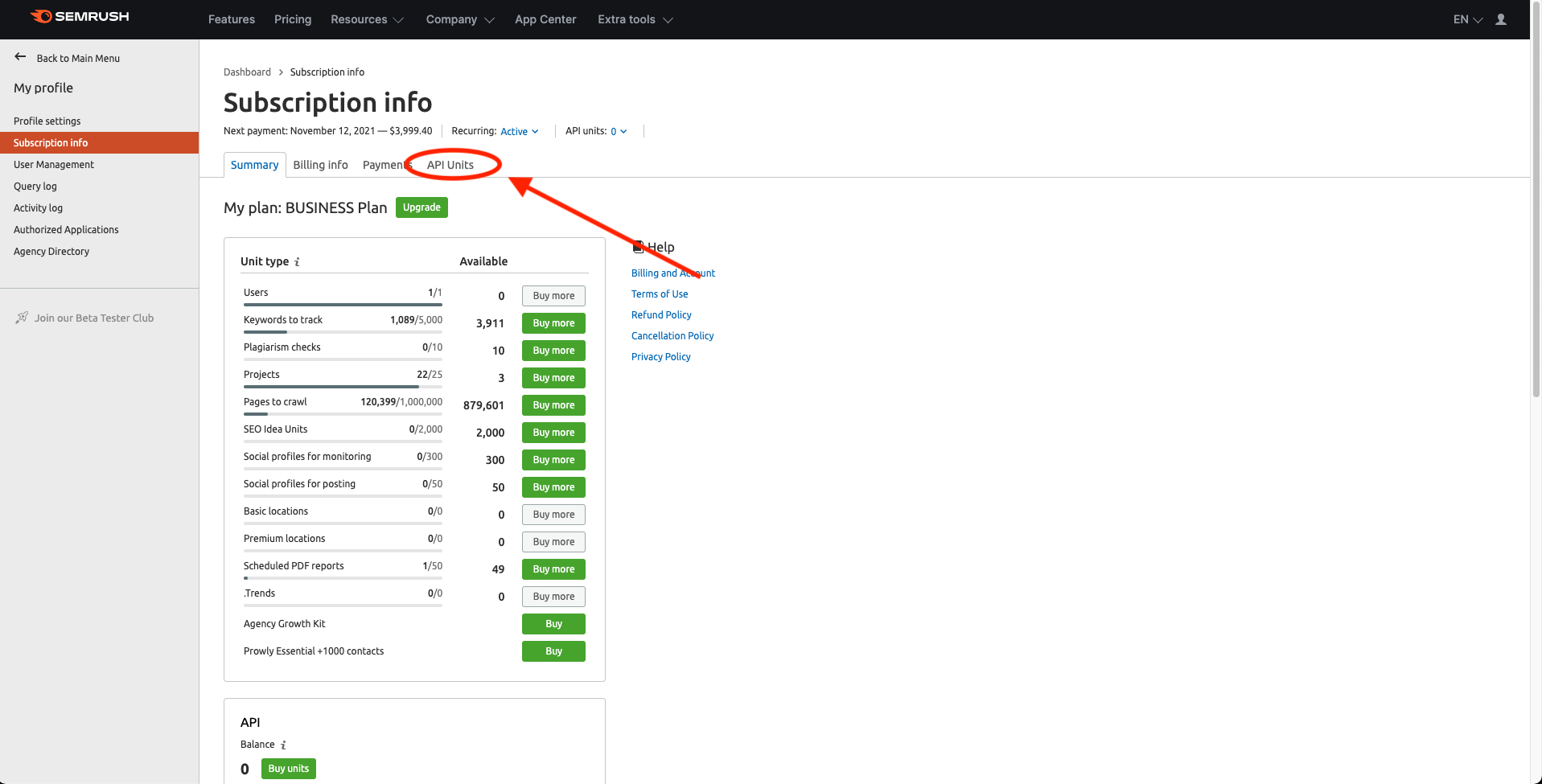 Once in Subscription info, navigate to the API Units tab under the Subscription info header