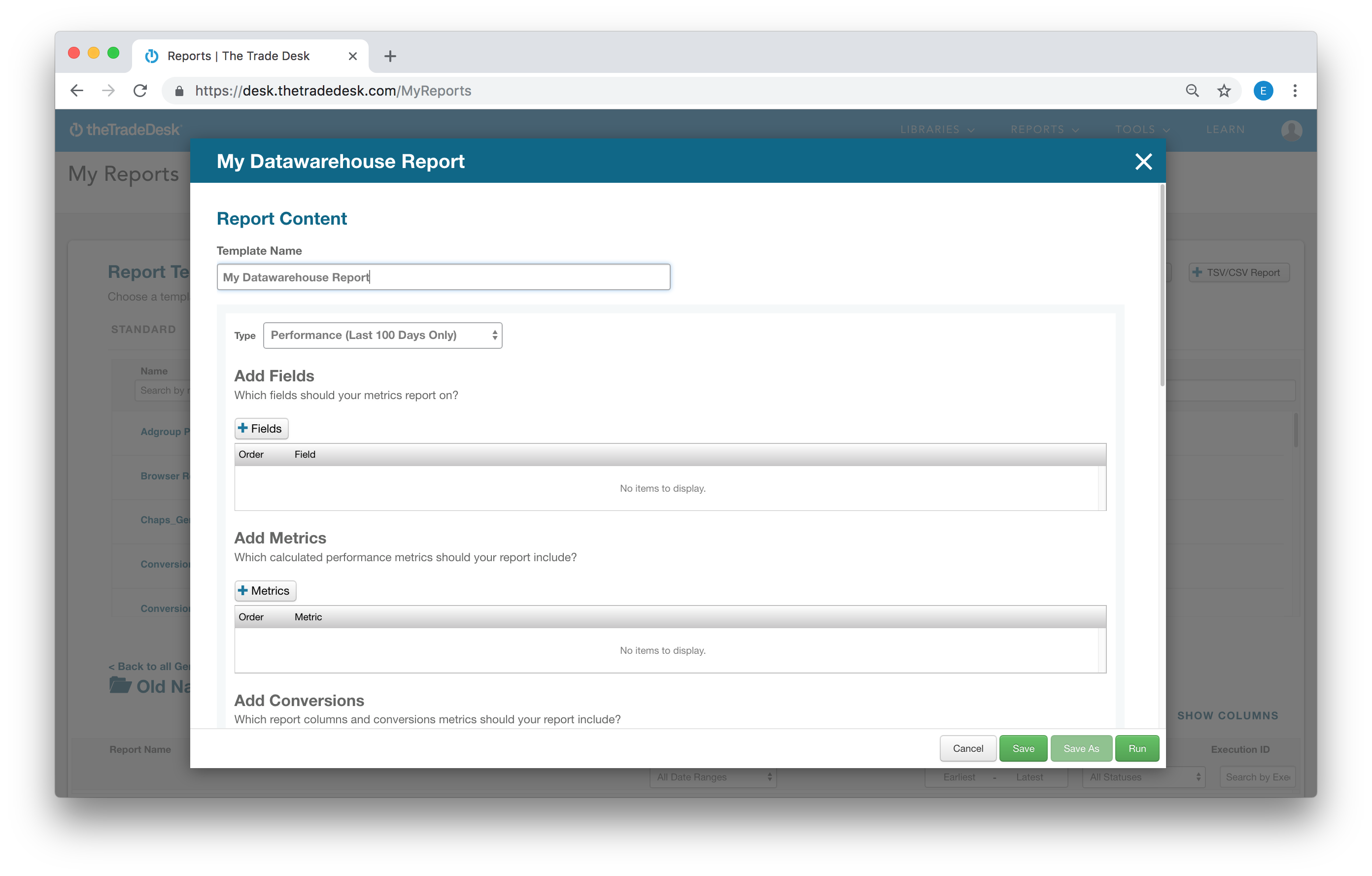 Because of the way The Trade Desk's API functions, the report that we want to pull using the API, must first be created in The Trade Desk's My Reports app at https://desk.thetradedesk.com/MyReports.