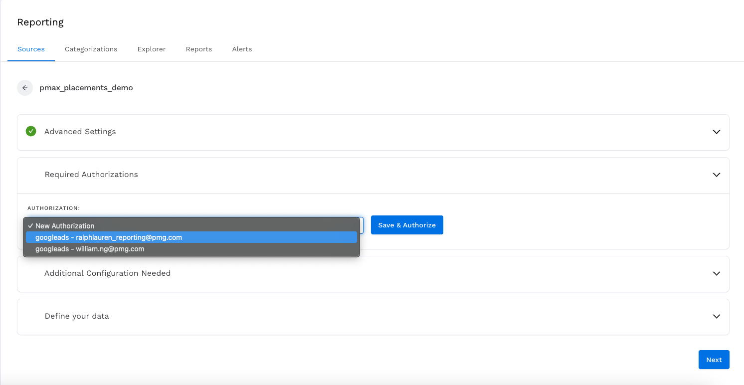 Choose an account for authorization. The best is to use the reporting account. Click Next