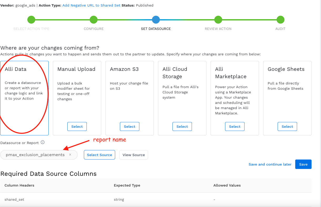 4a. Set up Alli Datasource to pull existing PMAX Placements from Shared Sets