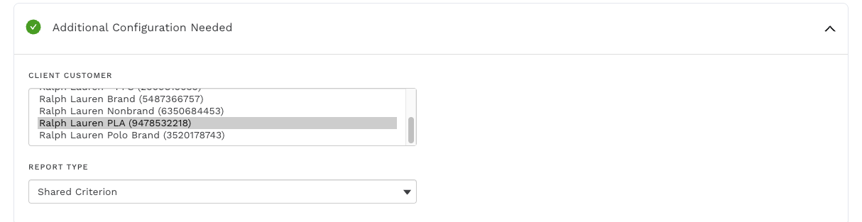 Select the customer that your shared set is in, so in my example, I will pick the Ralph Lauren PLA (9478532218) account. For report type, select: Shared Set