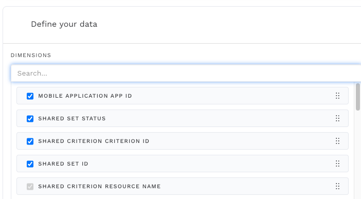 In the Define your data section, select the following fields: