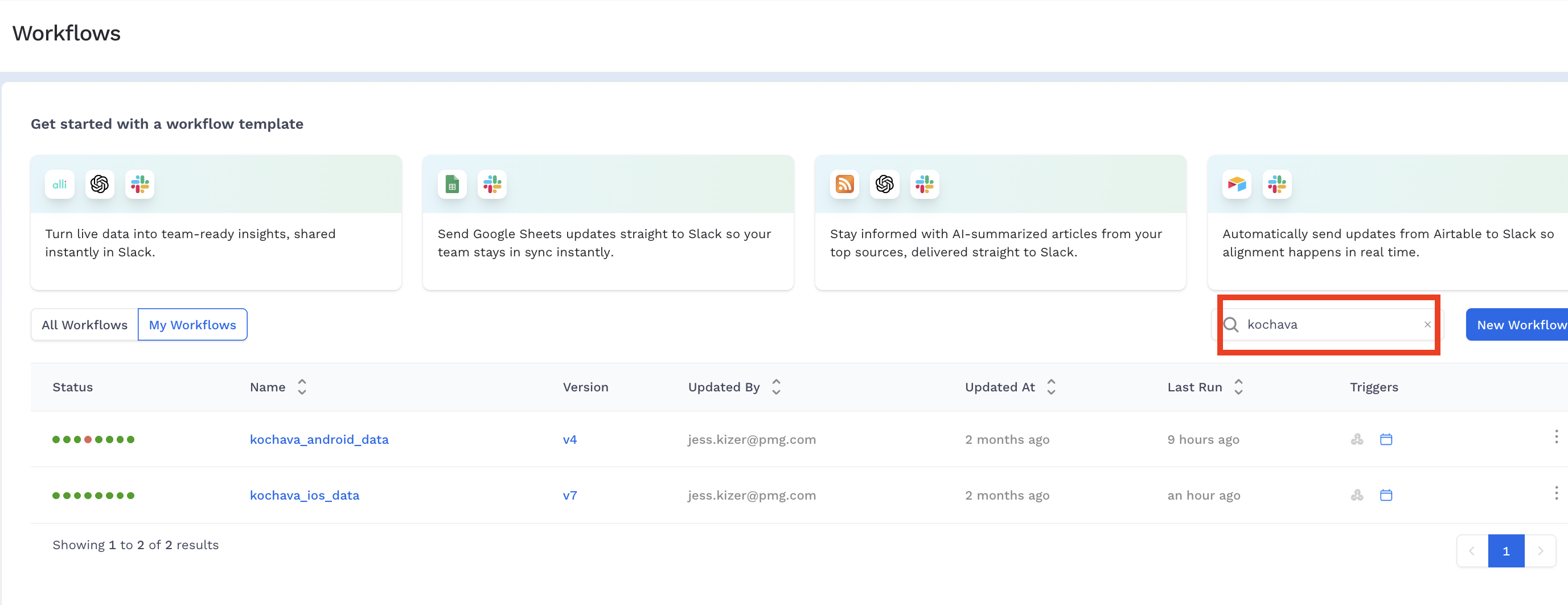 Actions → WorkflowsUse the search bar to find the partner (e.g., Smadex, Kochava, Appsflyer, etc.)