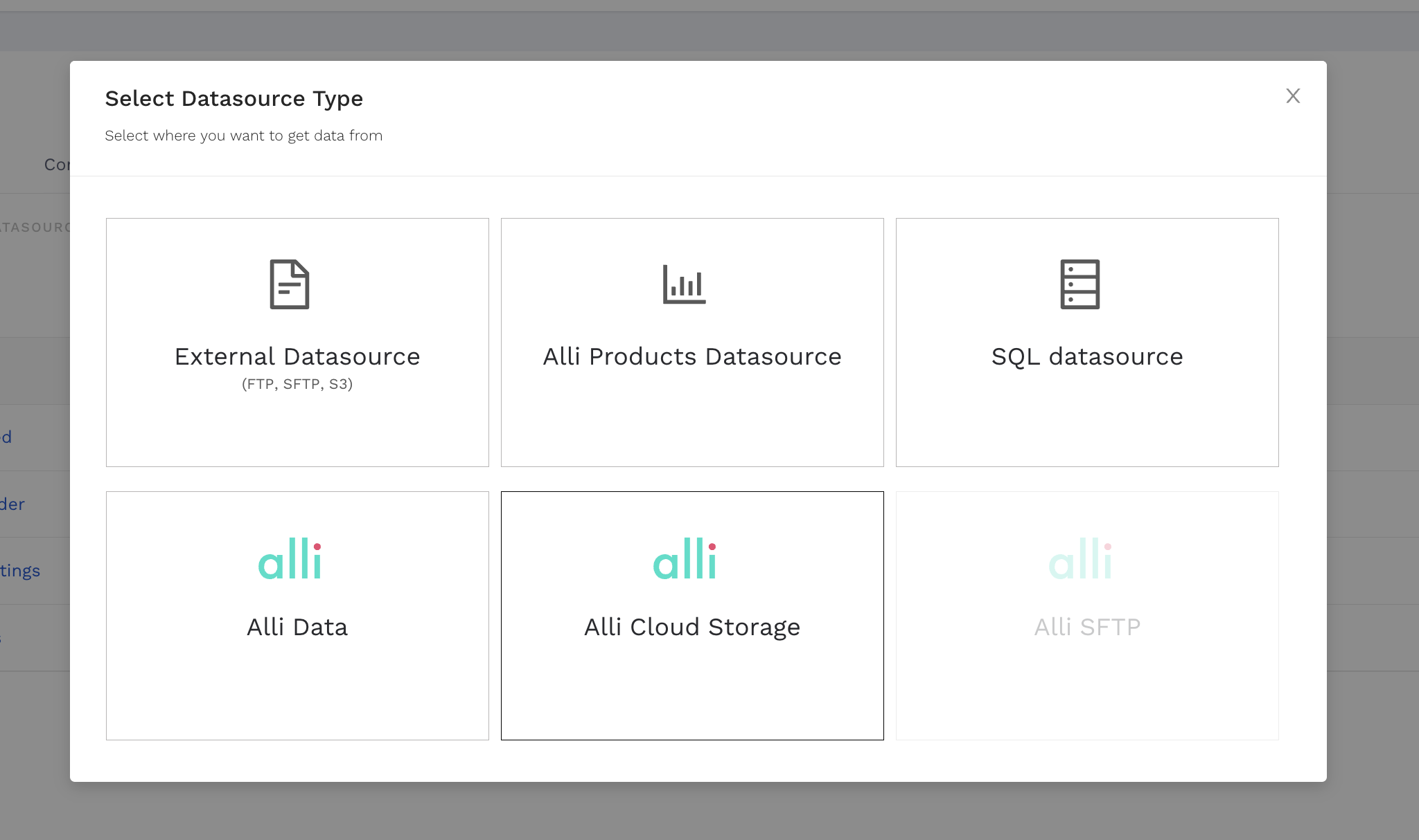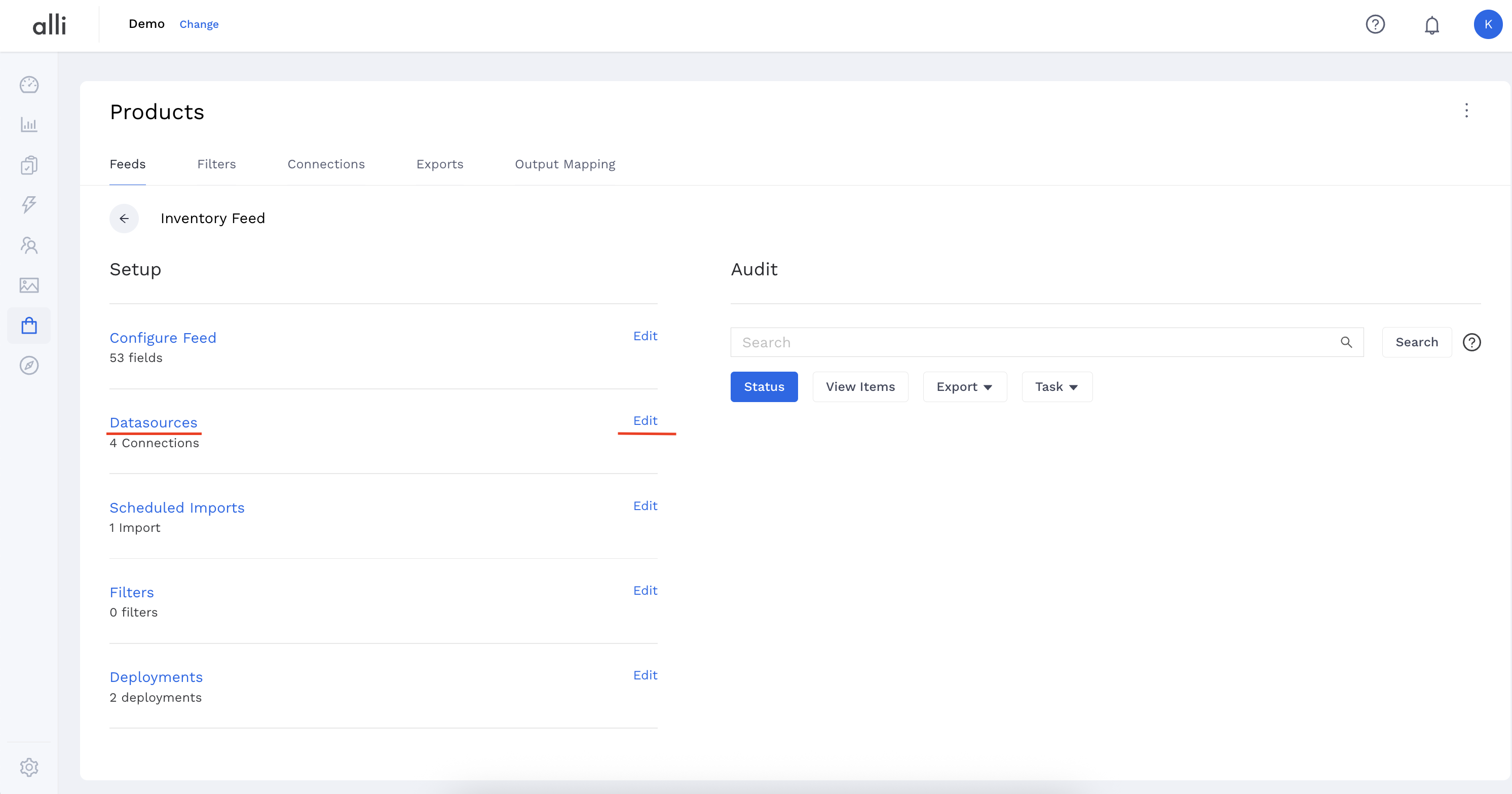 Under Products and Feeds from the top hand navigation, click on the feed you’d like to set up a datasource in or if you have not yet created one, follow the Tutorial: Getting Started with Alli Products instructions.