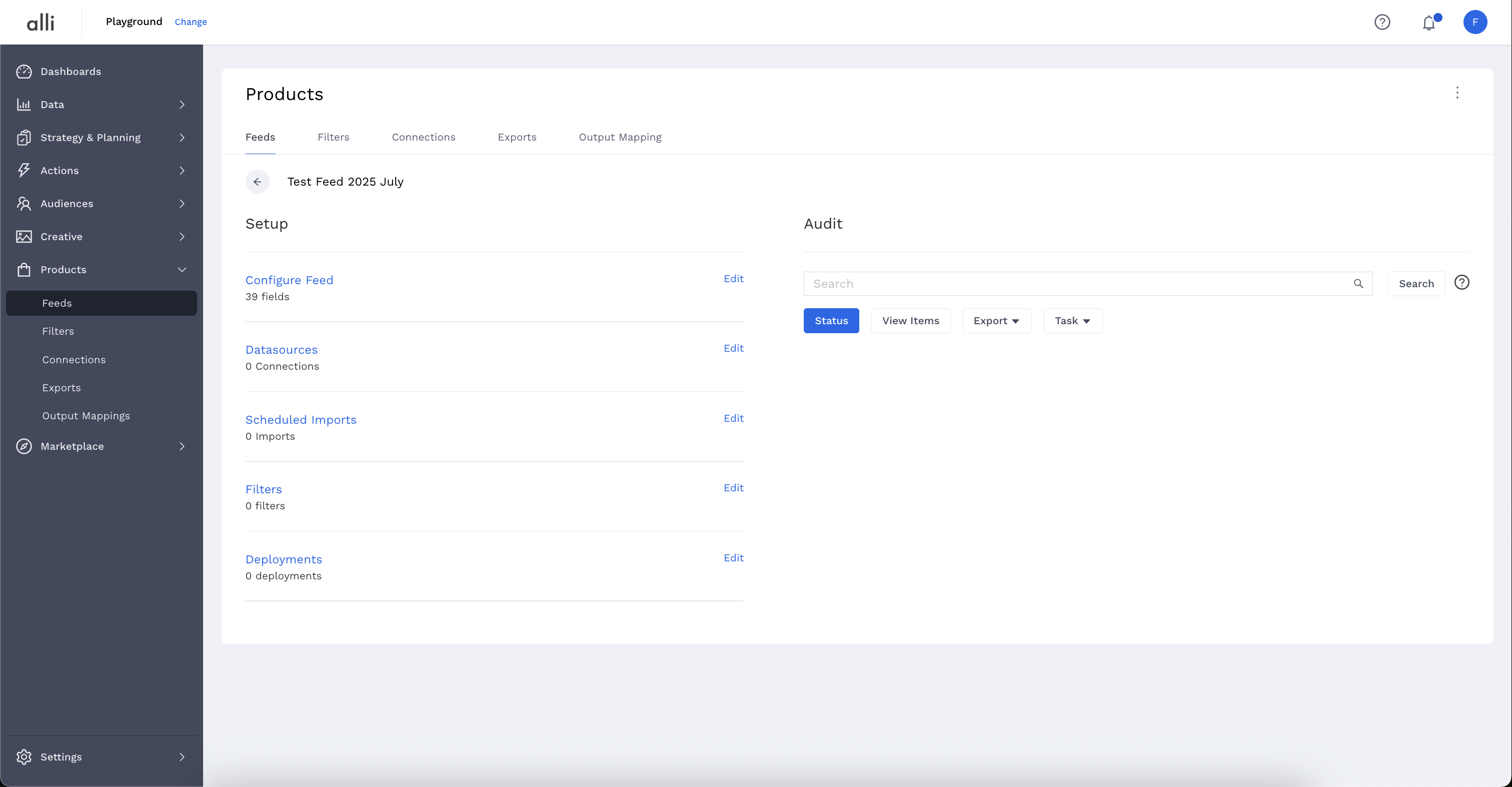 From the left-hand navigation, select Products. This page shows an overview of all Active Feeds, with additional tabs to see All Feeds and Inactive Feeds if needed. To add a new feed, click the blue Add Feed button on the far right side.