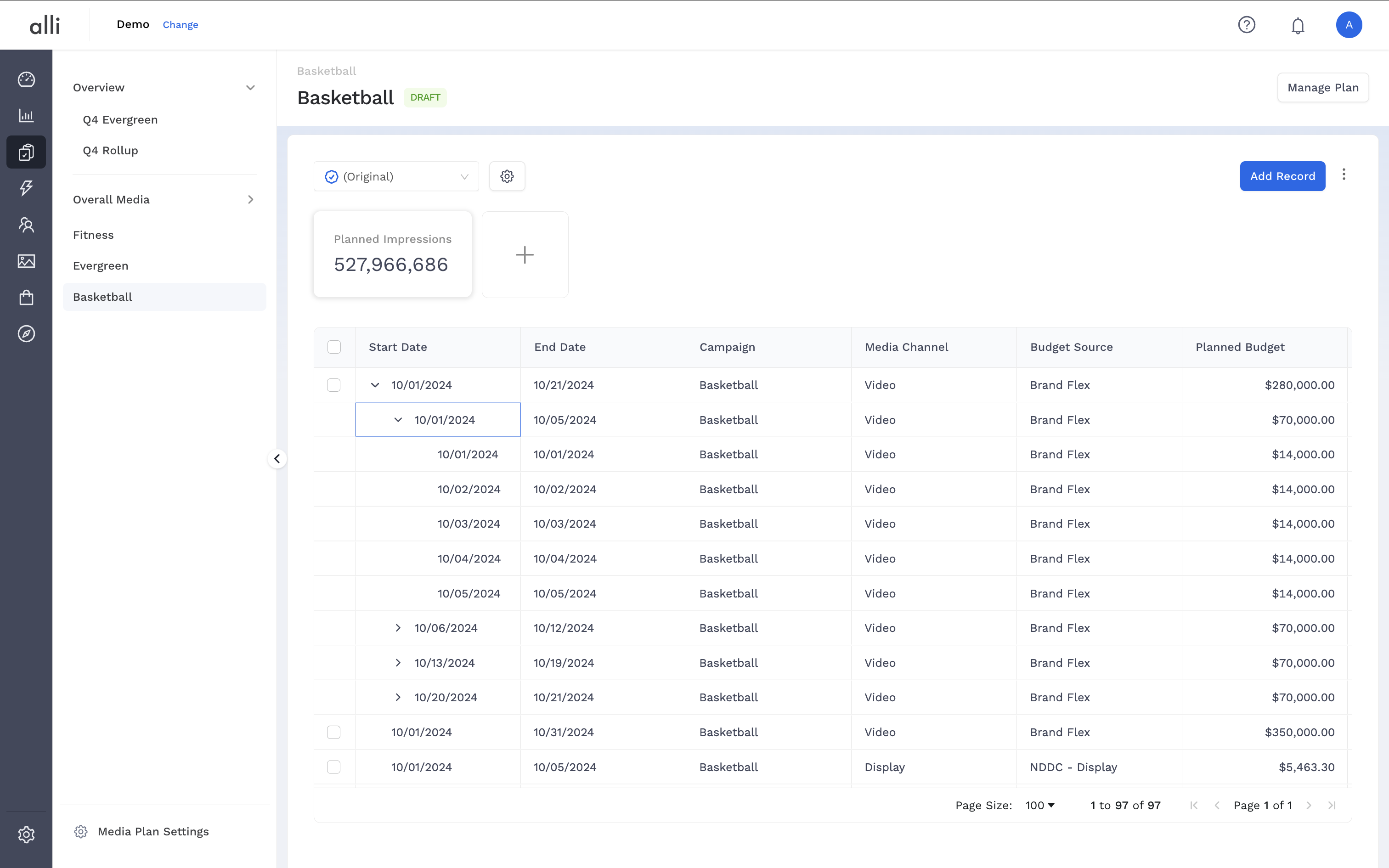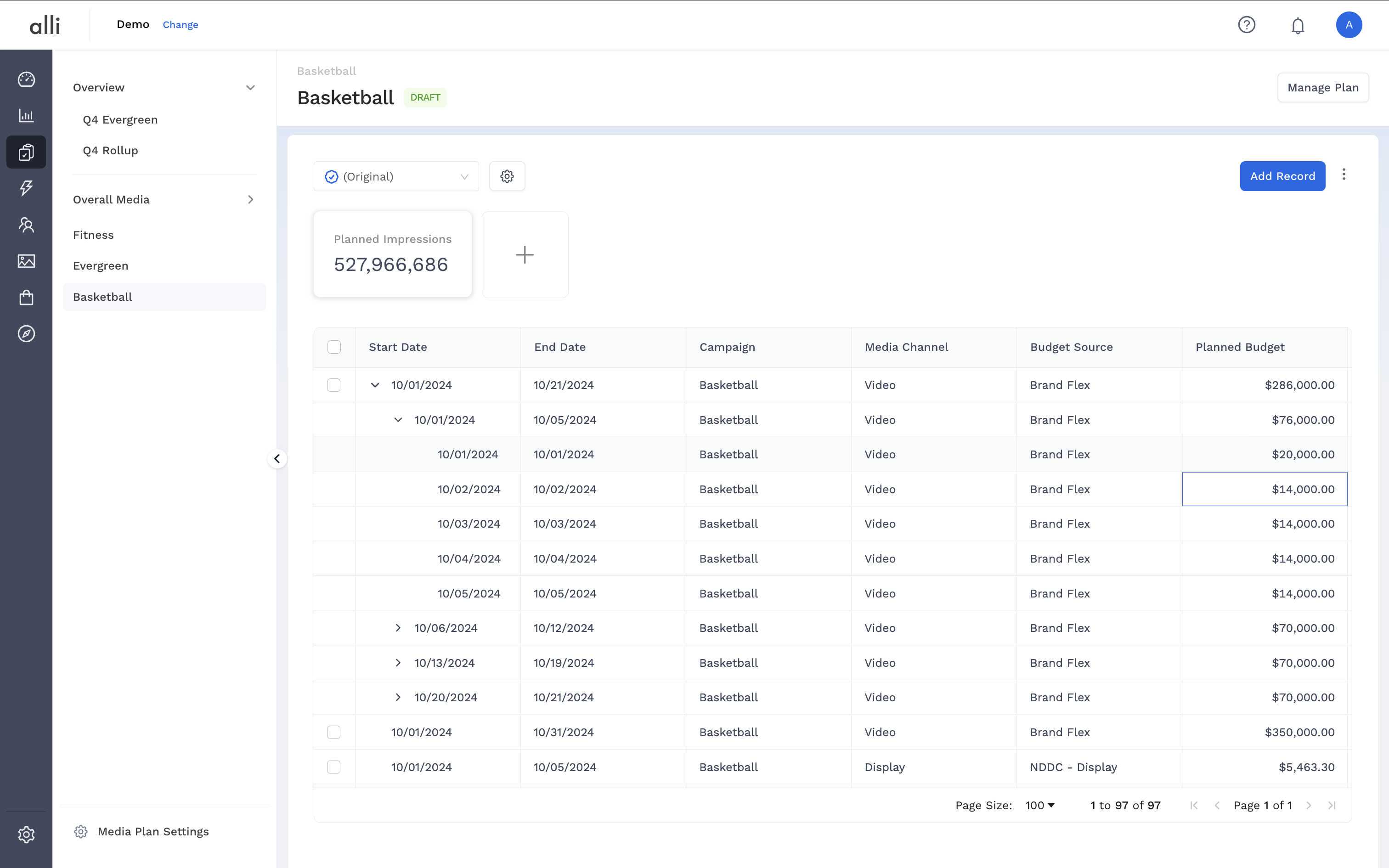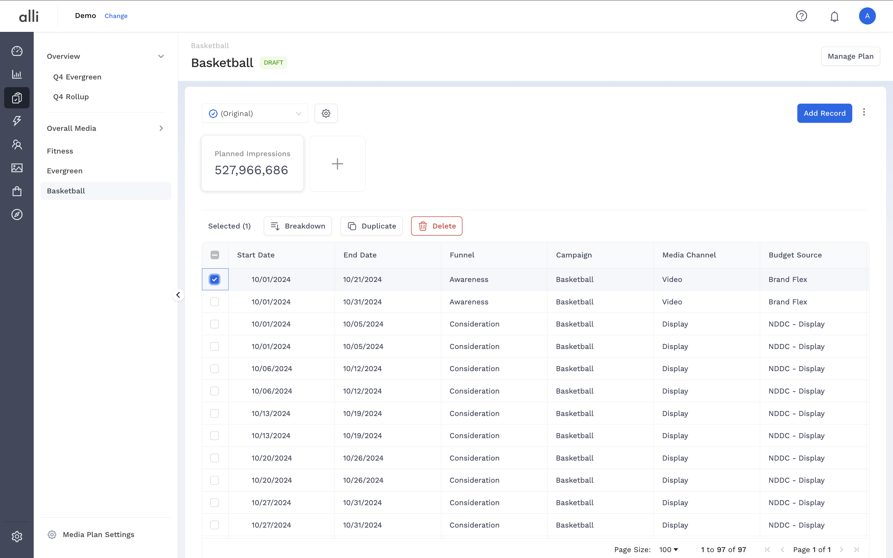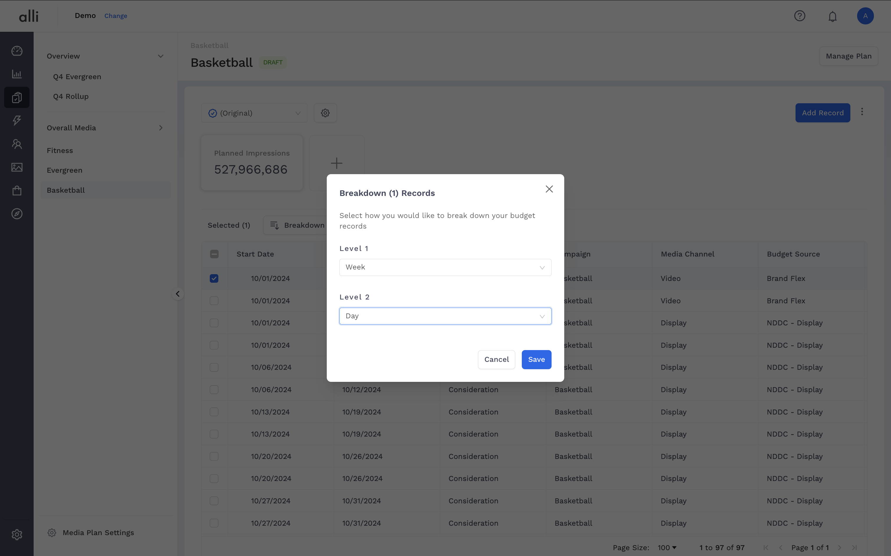 The Budget Record Breakdown feature helps you distribute a single budget record across finer time intervals — such as weeks or days — with just a few clicks. This makes pacing and performance alignment more accurate, especially when planning multi-day or multi-week campaigns.