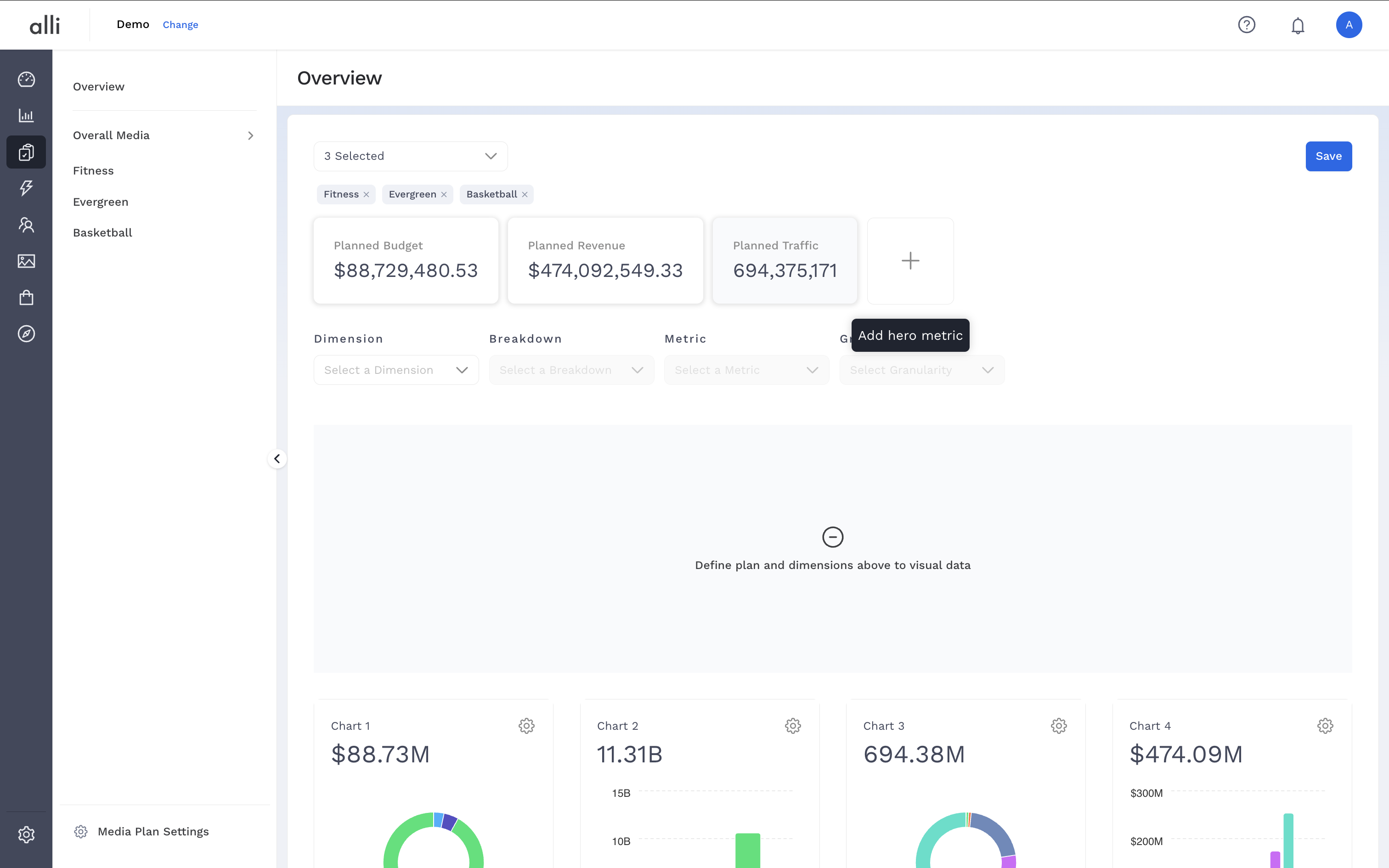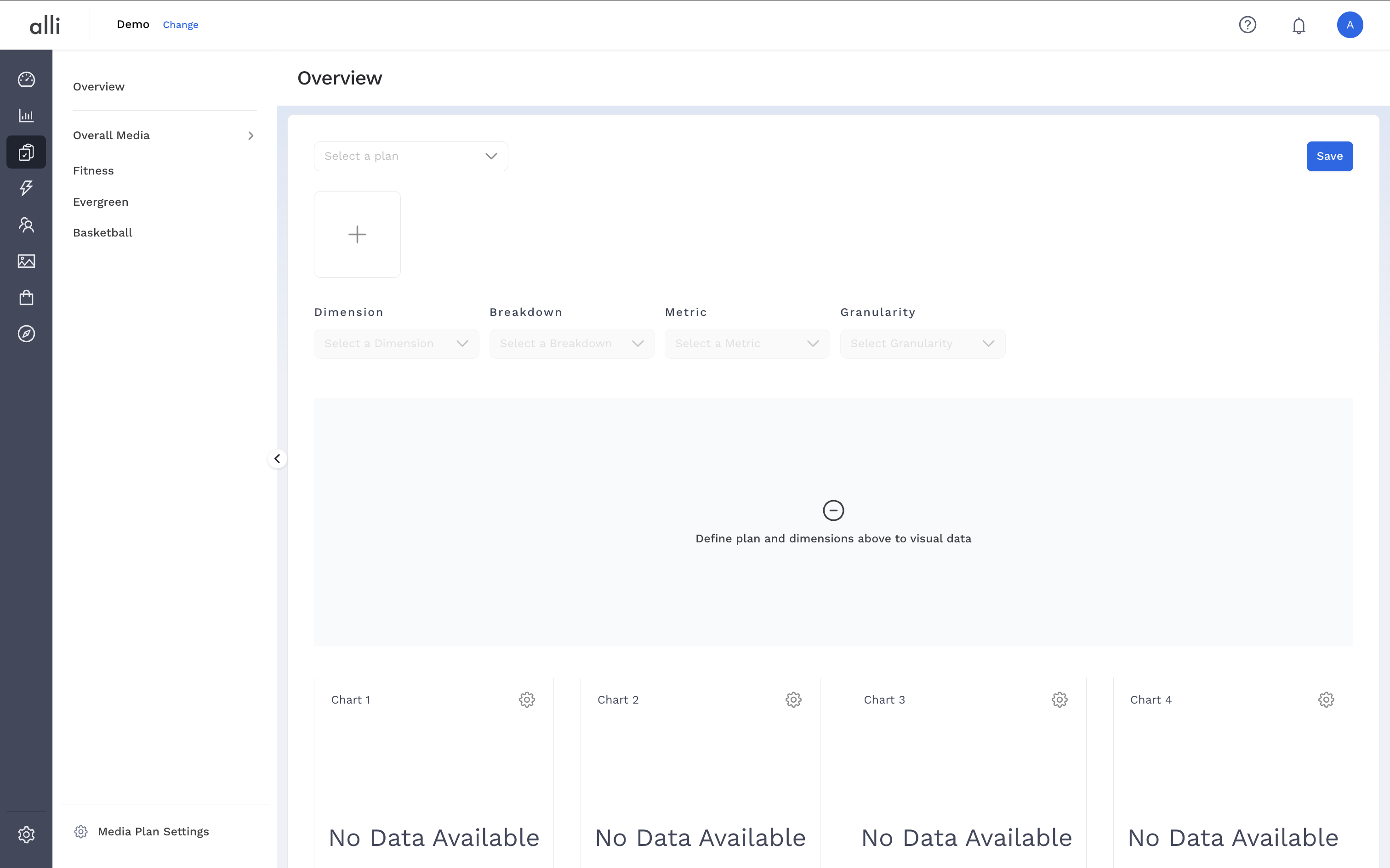 Overview visuals are limited to Admin Columns only. If you do not see any dimensions or metrics available to select, ensure that the client owner has configured admin columns for use across all plans in the client. How-To: Create Admin Columns