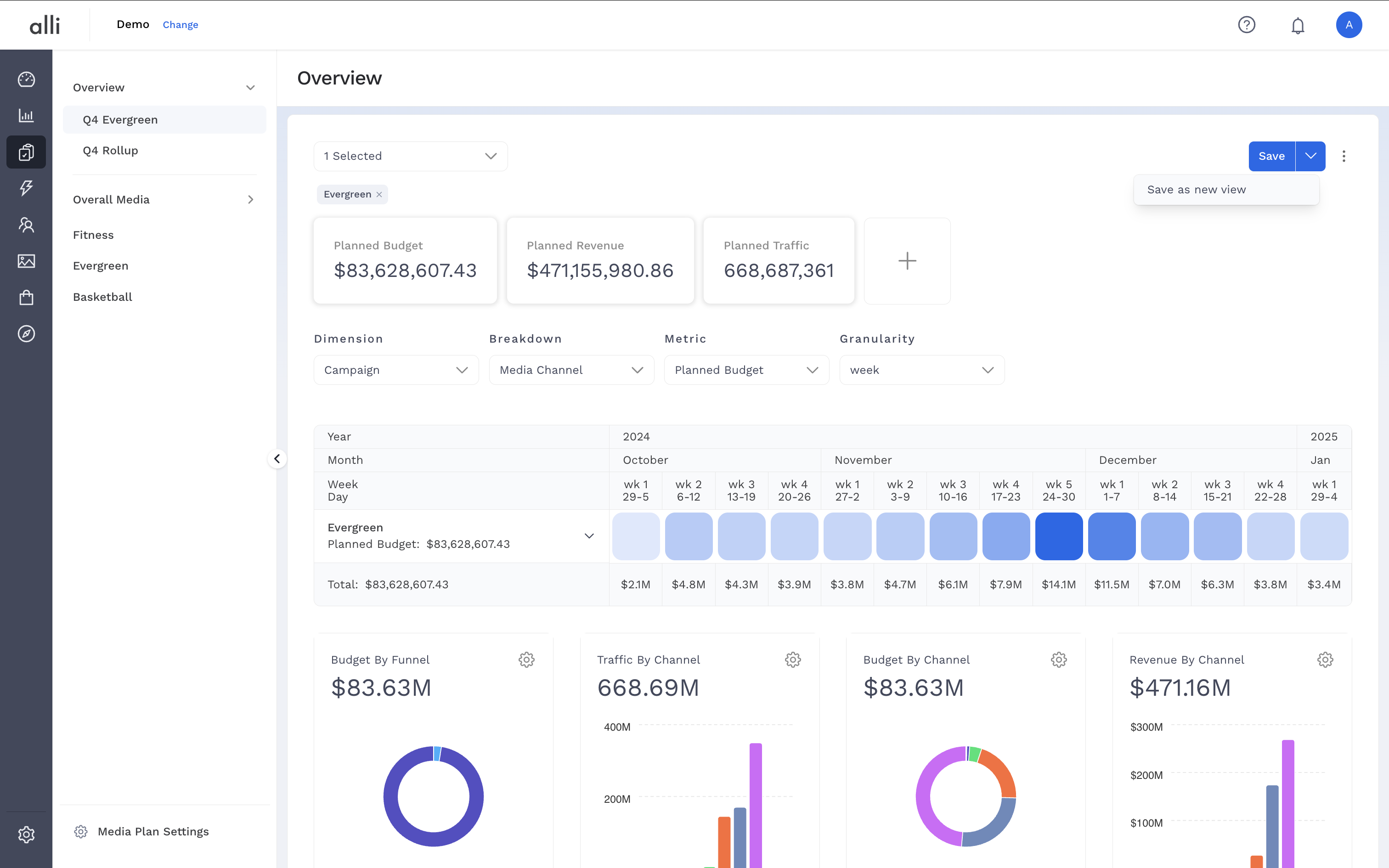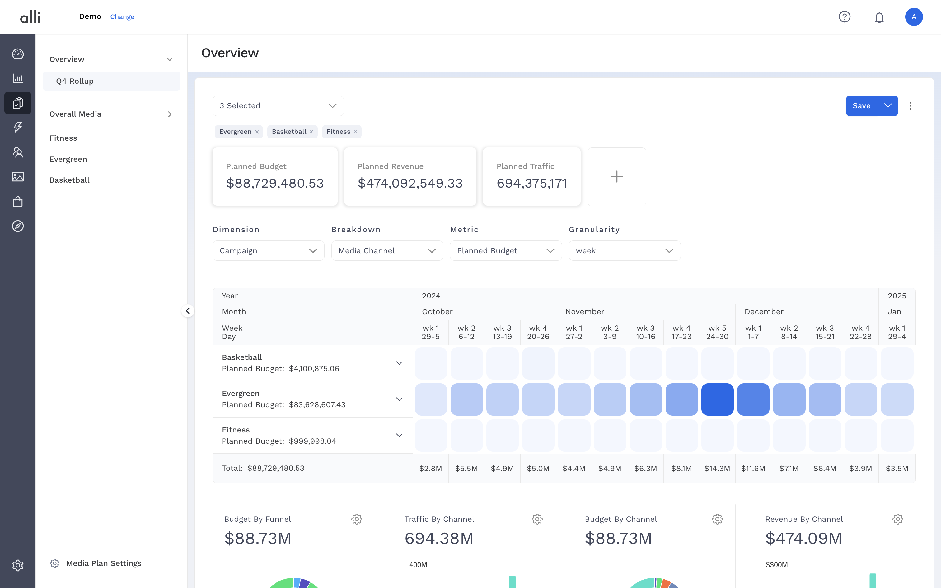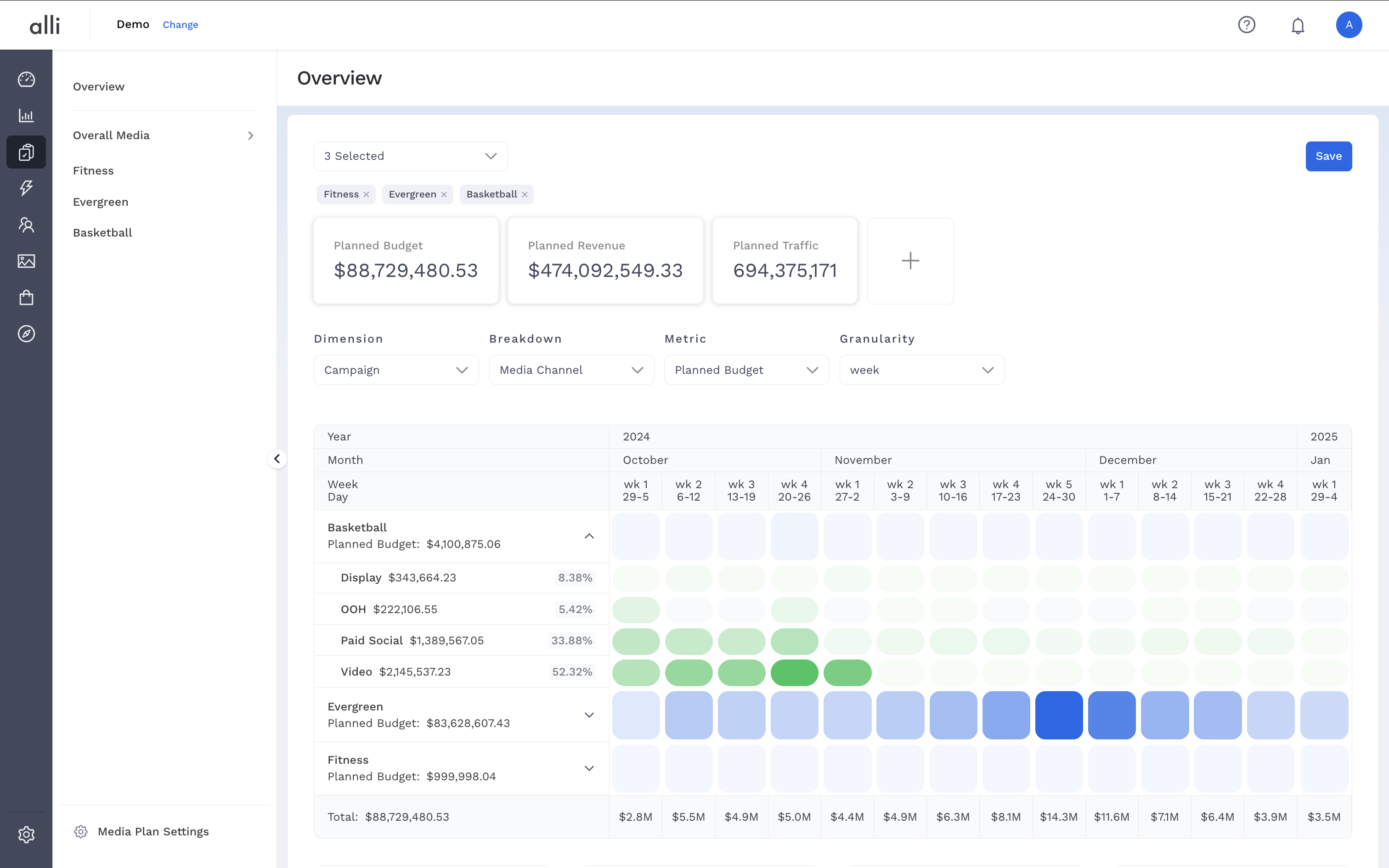 Navigate to the Overview section by going to: Planning & Strategy → Media Planner and select one or multiple plans to visualize.